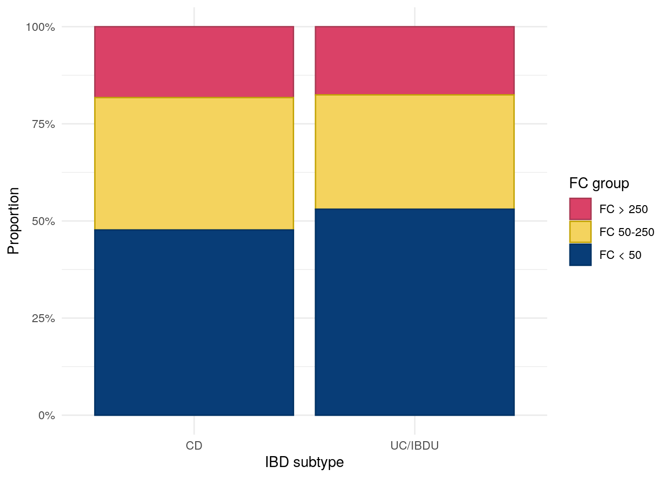 From Figure 2, we can see subjects with UC/IBDU are more likely to have FC < 50, whiilst CD subjects are more likely to have FC 50-250. Roughtly the same proportion of subjects with CD and UC/IBDU have FC > 250.