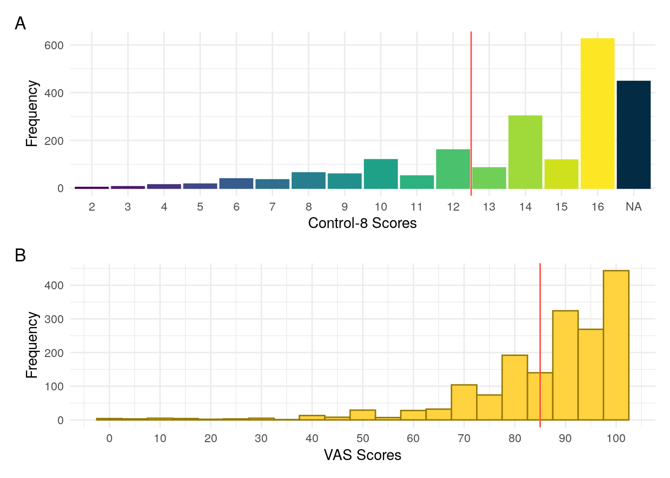 Figure 5: Distributiuon of IBD Control scores for (A) Control-8 and (B) Visual analogue scale. The vertical red lines denote the cut-offs for quiescent disease reported by Bodger et al. (2013).