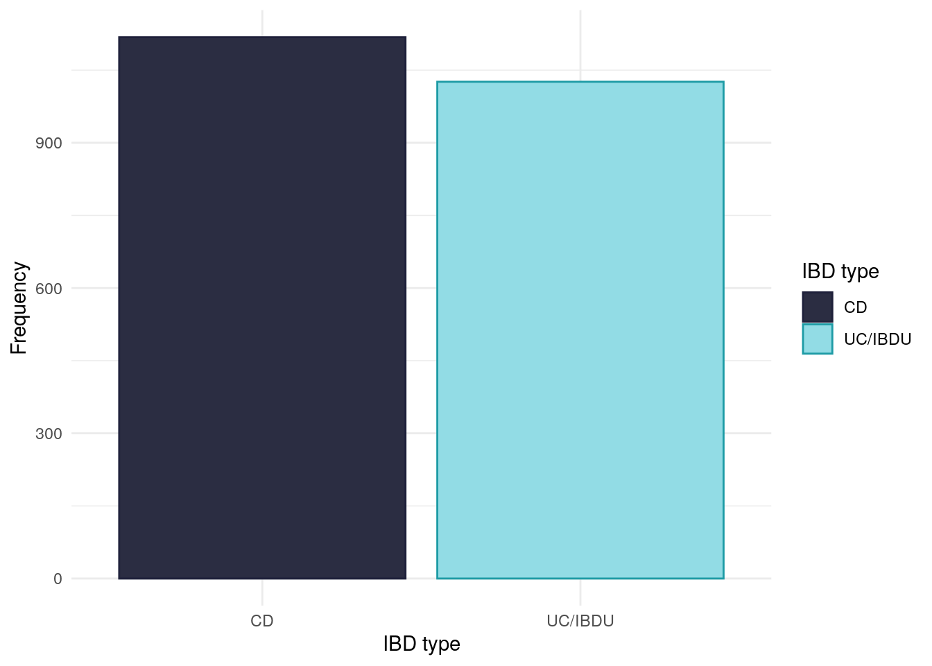 For this study, we have grouped ulcerative colitis (UC) and inflammatory bowel disease unclassified (IBDU) into one category. IBD type is self-reported.
