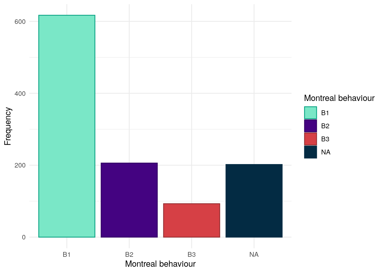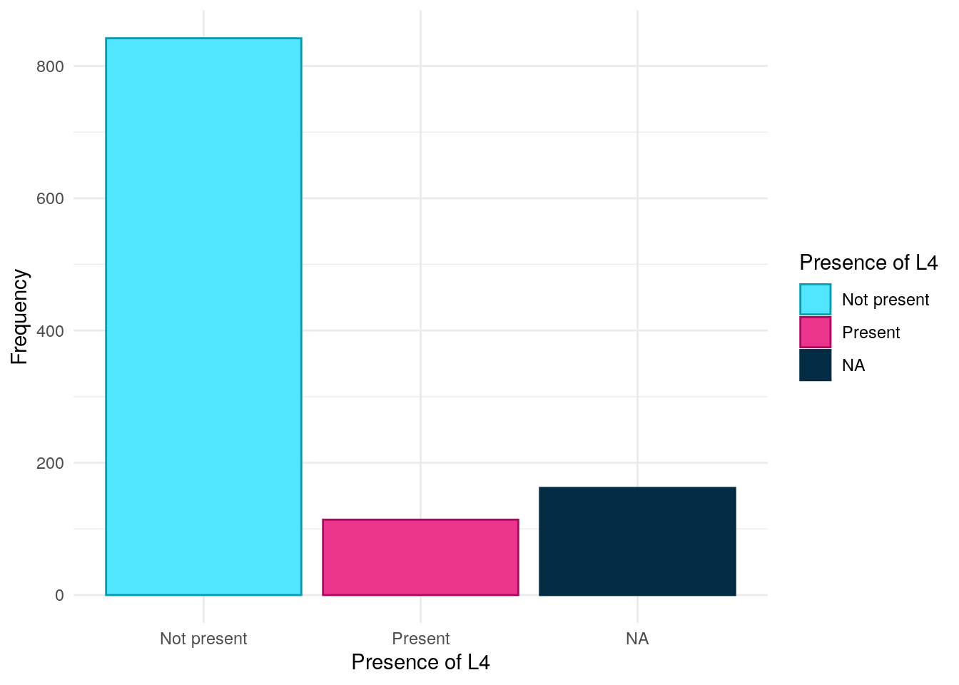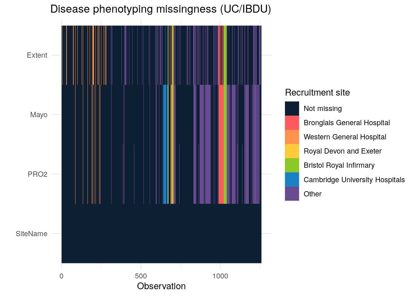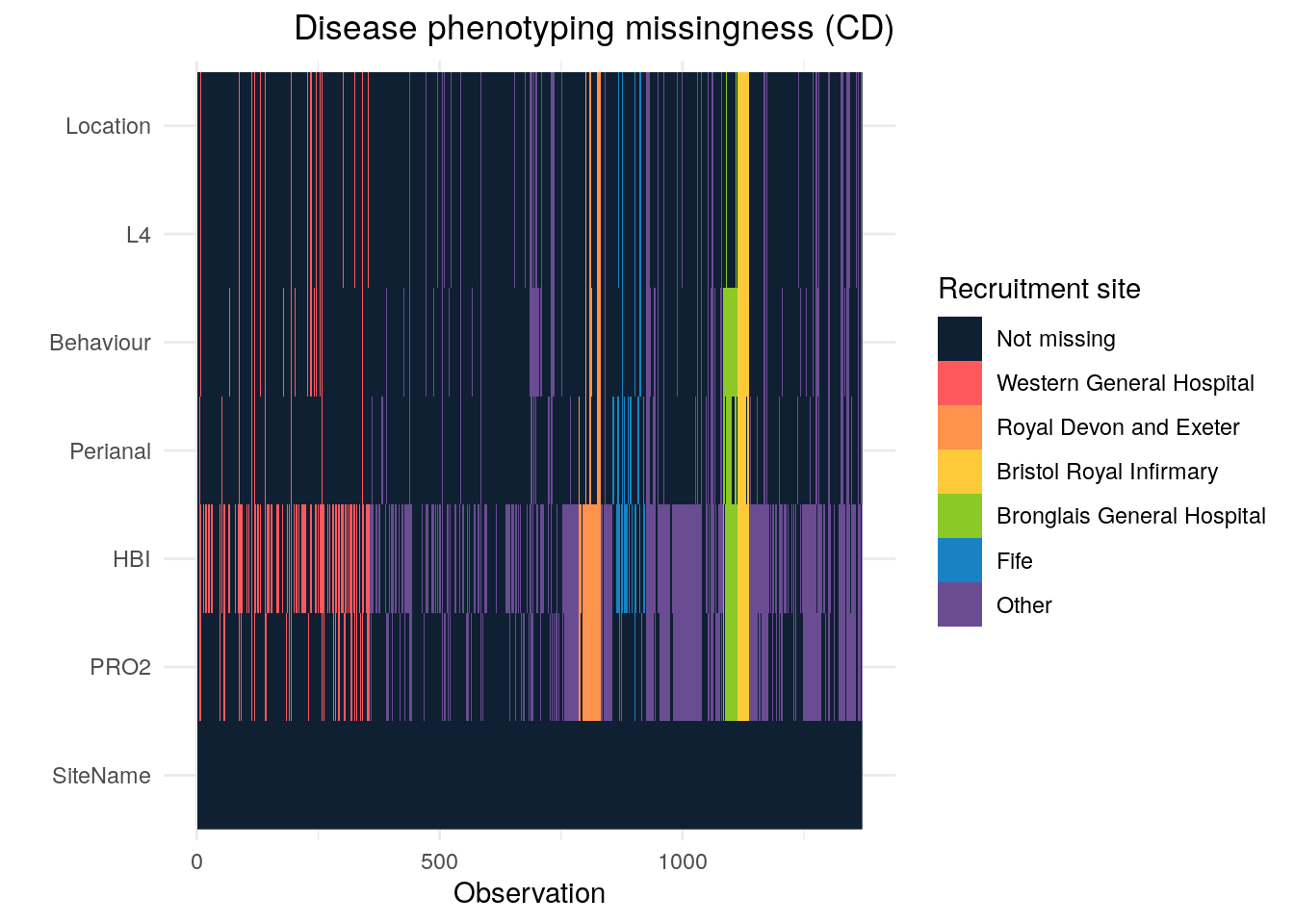 Montreal location has been obtained from REDcap data. Rather than being asked for Montreal location directly, clinical teams were asked to provide more granular detail by ticking boxes if inflammation was in any of the following areas Oesophago-gastric, Duodenal, Jejunal, Ileal, Colonic, Rectal. If only any of the first 3 were reported then the subject was assigned “L4 only”. L1-L3 were assigned as per convention (Silverberg et al. 2005). If no location was reported then location was assigned NA.