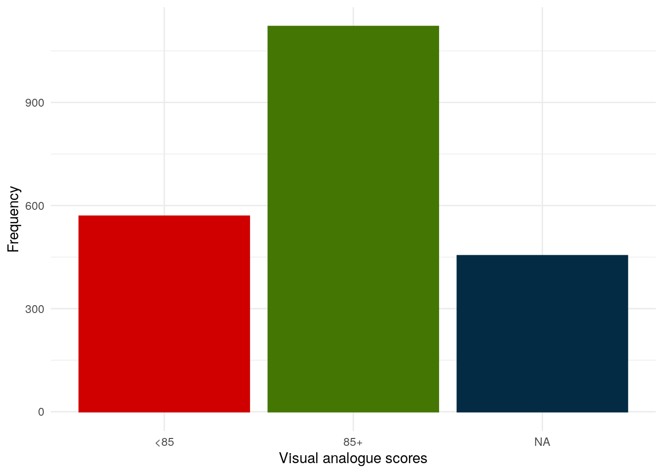 Instead to treating VAS as a continuous value, going forward, VAS will be discretised into below 85 and 85 and above as a VAS of 85 was found by Bodger et al. (2013) to be predictive of quiescent disease.