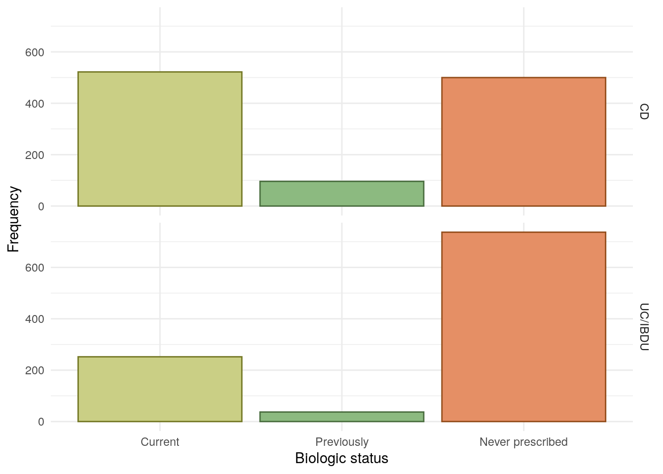 Biologic treatments are defined as infliximab, adalimumab, golimumab, vedolizumab, and ustekinumab.