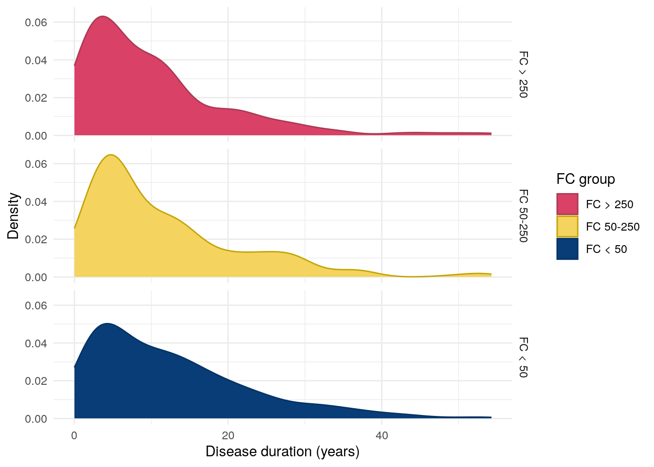 Whilst a low p-value was observed, disease duration was not significantly different between FC groups.