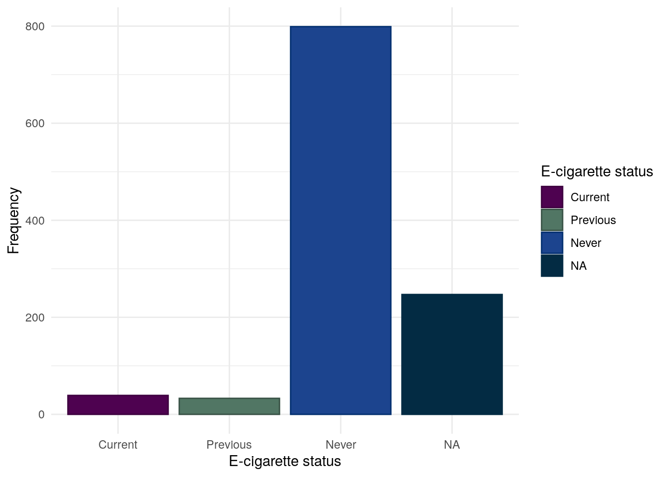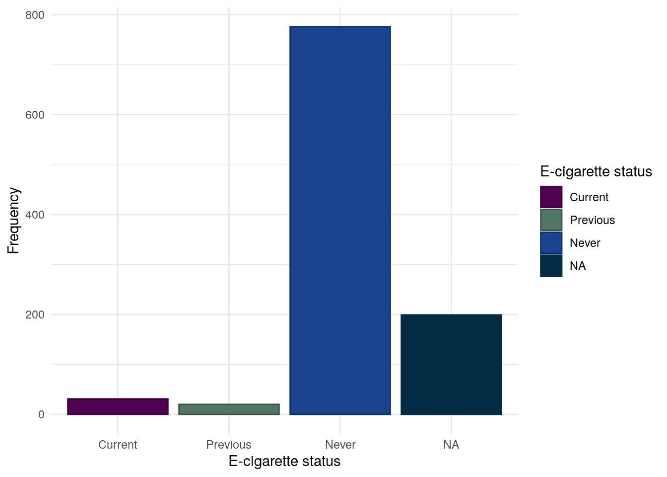 The vast majority of participants do not report using some form of e-cigarettes. It should be noted that as recruitment ended March 2020, these day may not reflect more modern trends.