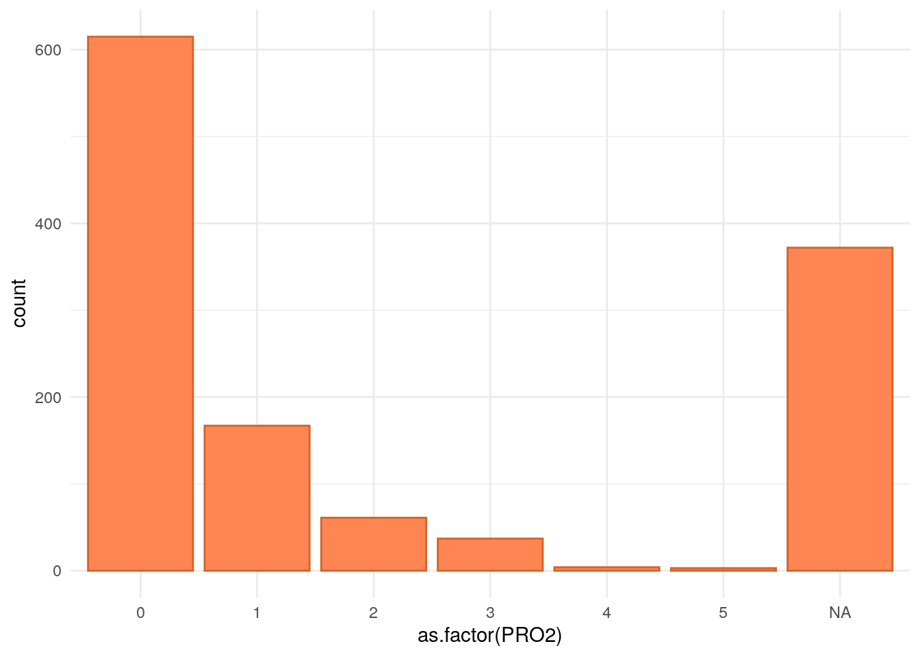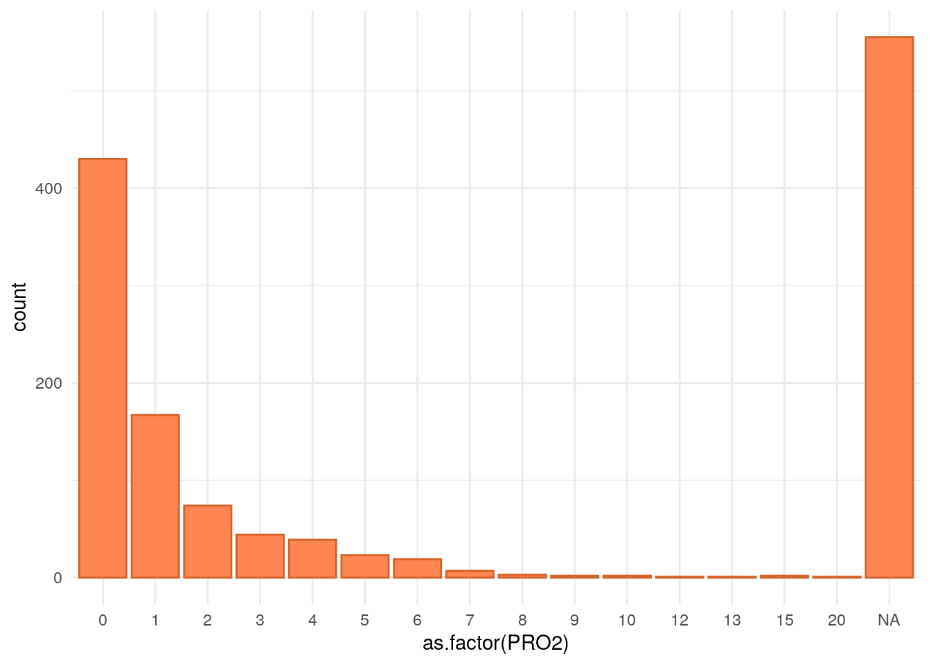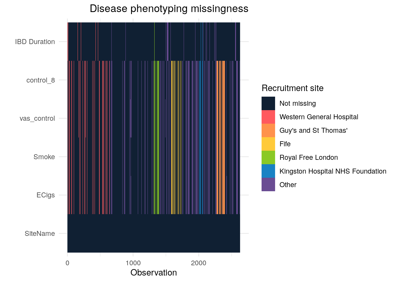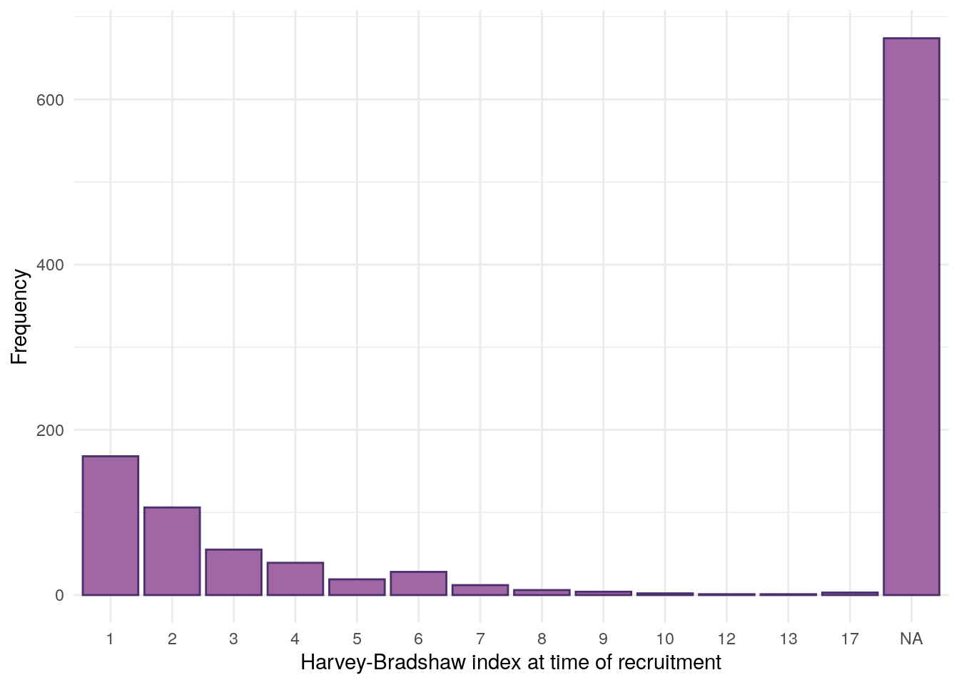 IBD<-read_xlsx(paste0(data.path, "Baseline2022/IBD.xlsx"))# create flare_group in IBD_C and make into levelIBD<-IBD%>%mutate(flare_group =ifelse(FlaresInPastYear==0,"No Flares","1 or More Flares"))IBD$flare_group<-factor(IBD$flare_group, levels =c("No Flares", "1 or More Flares"))IBD<-IBD%>%mutate(treatment =ifelse(TreatmentUseful==4,"Not On Treatment","On Treatment"))IBD$treatment<-factor(IBD$treatment, levels =c("Not On Treatment", "On Treatment"))# correcting scores where No is favourable and Yes is unfavourable outcomes# answer options were always YES/NO/Not sureif(any(IBD$MissPlannedActivities==3)){IBD<-IBD%>%mutate_at(vars("MissPlannedActivities":"NewSymptoms"),~recode(., `3` =1, `2` =2, `1` =0))}# correct TreatmentUseful (Yes is favourable, No unfavourable)# not on treatment was assigned the value 1if(any(IBD$TreatmentUseful==3)){IBD<-IBD%>%mutate_at("TreatmentUseful",~recode(., `4` =2, `3` =1, `2` =0, `1` =2))}# exclude rows with missing data, 17 participants excluded for missing IBD-control questionnaire dataIBD<-IBD%>%filter(!rowSums(is.na(select(., 17:27)))>0)# new column with total control scoreIBD<-IBD%>%mutate(control_score =rowSums(select(., 17:27), na.rm =TRUE))# new column with IBD-control-8 score# added 2 to make comparable to future scores where the first question is asked to make comparable to future and against the cut off of 13 which indicates remissionIBD<-IBD%>%mutate(control_8 =TreatmentUseful+MissPlannedActivities+WakeUpAtNight+SignificantPain+OftenLackEnergy+AnxiousDepressed+NeedChangeTreatment+2)# create groups with cut off of IBD-control-8 scores quiescent (13 or above)/not quiescentIBD<-IBD%>%mutate(control_grouped =ifelse(control_8>=13, "13-16", "0-12"))IBD$control_8<-as.factor(IBD$control_8)IBD<-IBD%>%mutate(vas_control =ifelse(OverallControl>=85, "85+", "<85"))demo<-merge(demo, IBD[, c("ParticipantNo", "control_8", "OverallControl", "vas_control")], by ="ParticipantNo", all.x =TRUE, all.y =FALSE)