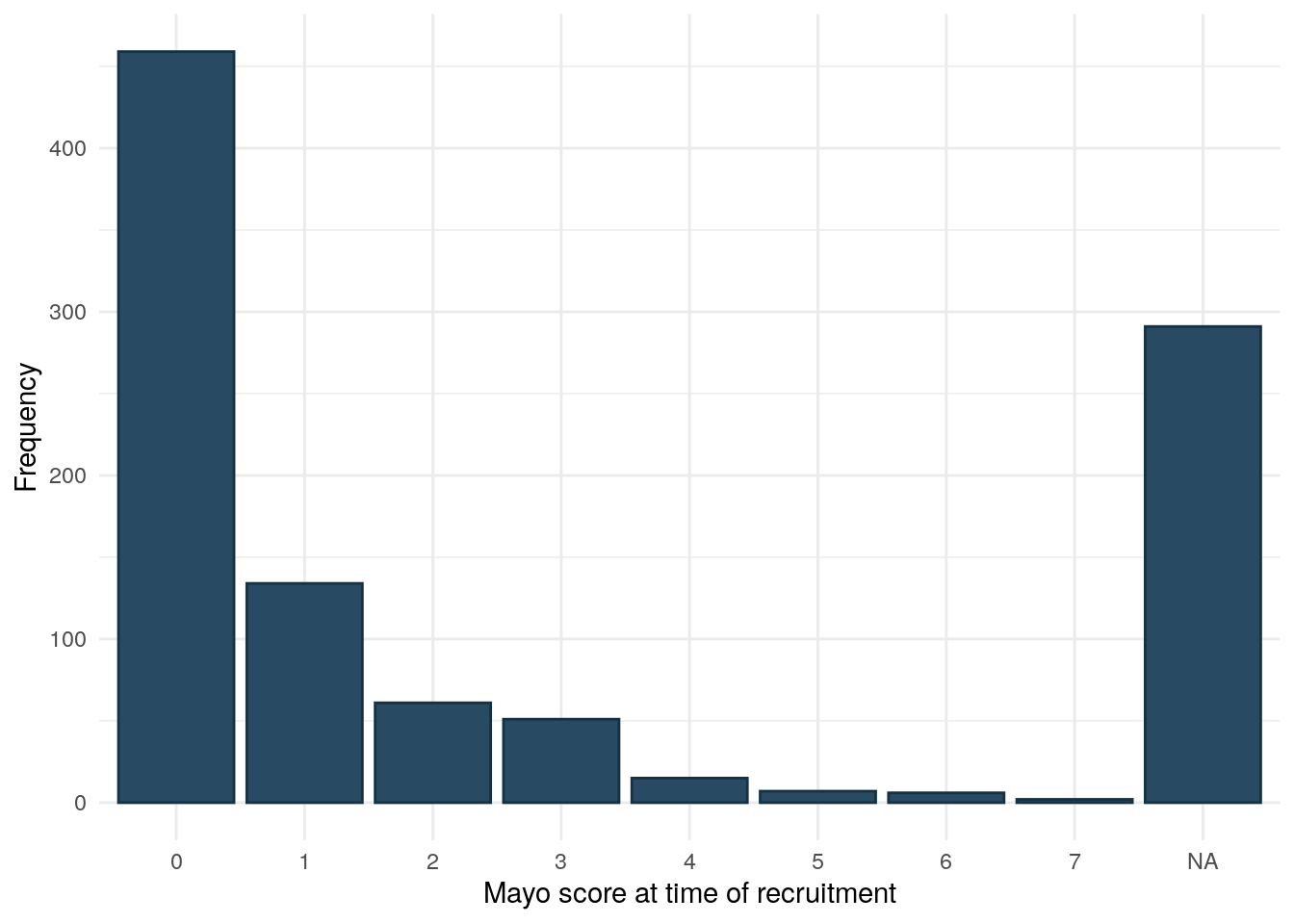 mayo.df<-redcap[, c("participantid", "current_mayo")]colnames(mayo.df)<-c("ParticipantId", "Mayo")mayo.df<-subset(mayo.df, ParticipantId%in%demo.uc$ParticipantId)demo.uc<-merge(demo.uc, mayo.df, by ="ParticipantId", all.x =TRUE)demo.uc%>%drop_na(cat)%>%ggplot(aes(x =as.factor(Mayo)))+geom_bar(fill ="#284B63", color ="#153243")+theme_minimal()+ylab("Frequency")+xlab("Mayo score at time of recruitment")