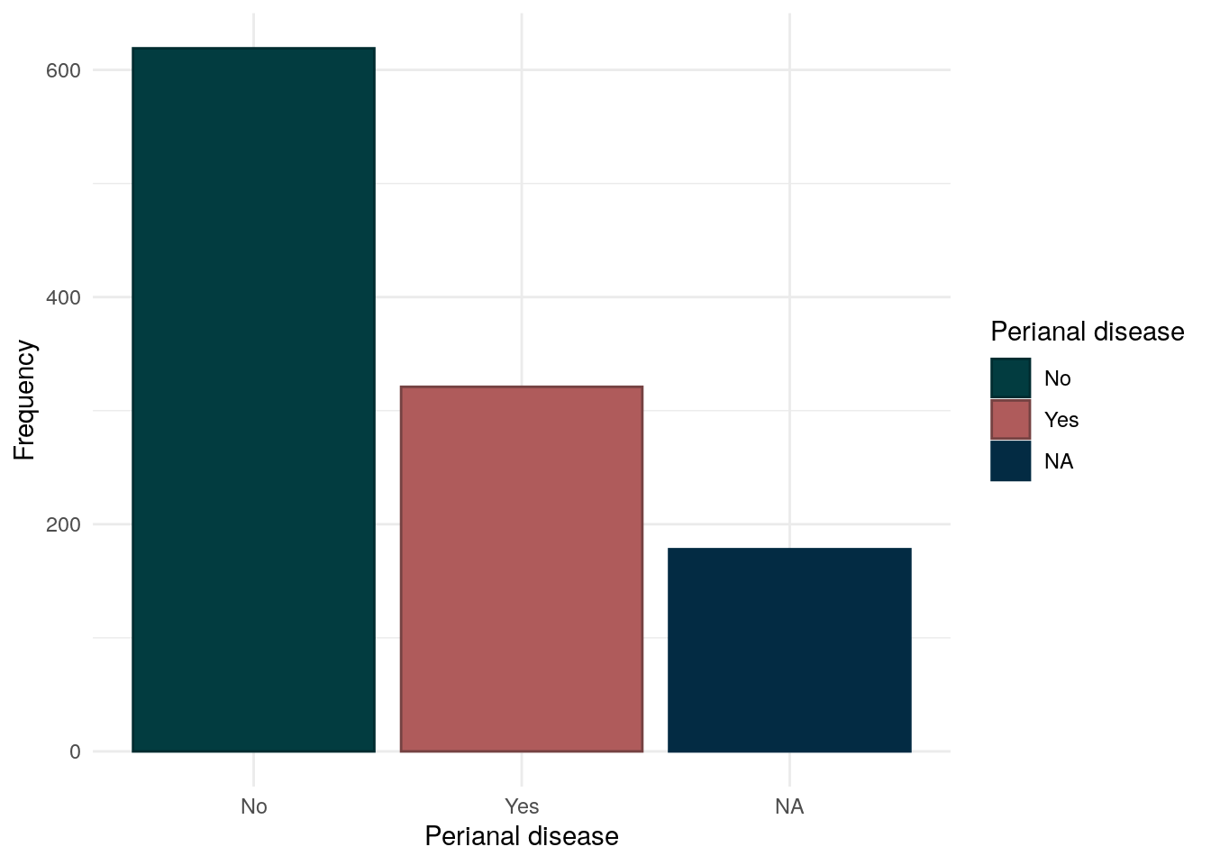predicct.surgery<-read_xlsx(paste0(data.path,"Baseline2022/IBD.xlsx"))[, c("ParticipantNo", "HadSurgeryForIBD")]colnames(predicct.surgery)[2]<-"Surgery"redcap.surgery<-redcap[, c("participantno", "surgery")]names(redcap.surgery)<-c("ParticipantNo", "Surgery")surgery<-rbind(redcap.surgery, predicct.surgery)surgery<-subset(surgery, !is.na(surgery$Surgery))# As REDCap is first, this will be prioritised over subject (if not NA)surgery<-distinct(surgery, ParticipantNo, .keep_all =TRUE)demo.cd<-subset(demo, diagnosis2=="CD")demo.cd<-merge(demo.cd, surgery, all.x =TRUE, all.y =FALSE)demo.cd$Surgery<-factor(demo.cd$Surgery, levels =c(2, 1), labels =c("No", "Yes"))