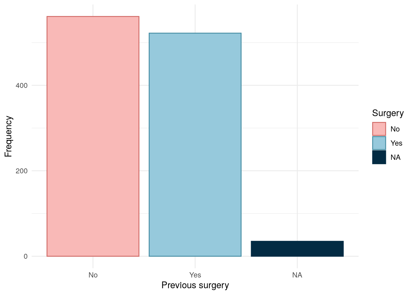 Surgical data has been obtained from both REDCap and patient-completed questionnaires. Where data are available from both data sources, REDCap is the preferred data source.