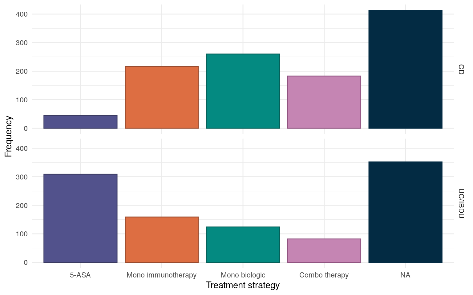 As should be expected given poor efficacy in CD, a 5-ASA treatment strategy is much more common for UC/IBDU participants (Figure 7). Mono biologic therapy is the most common treatment strategy for CD subjects.