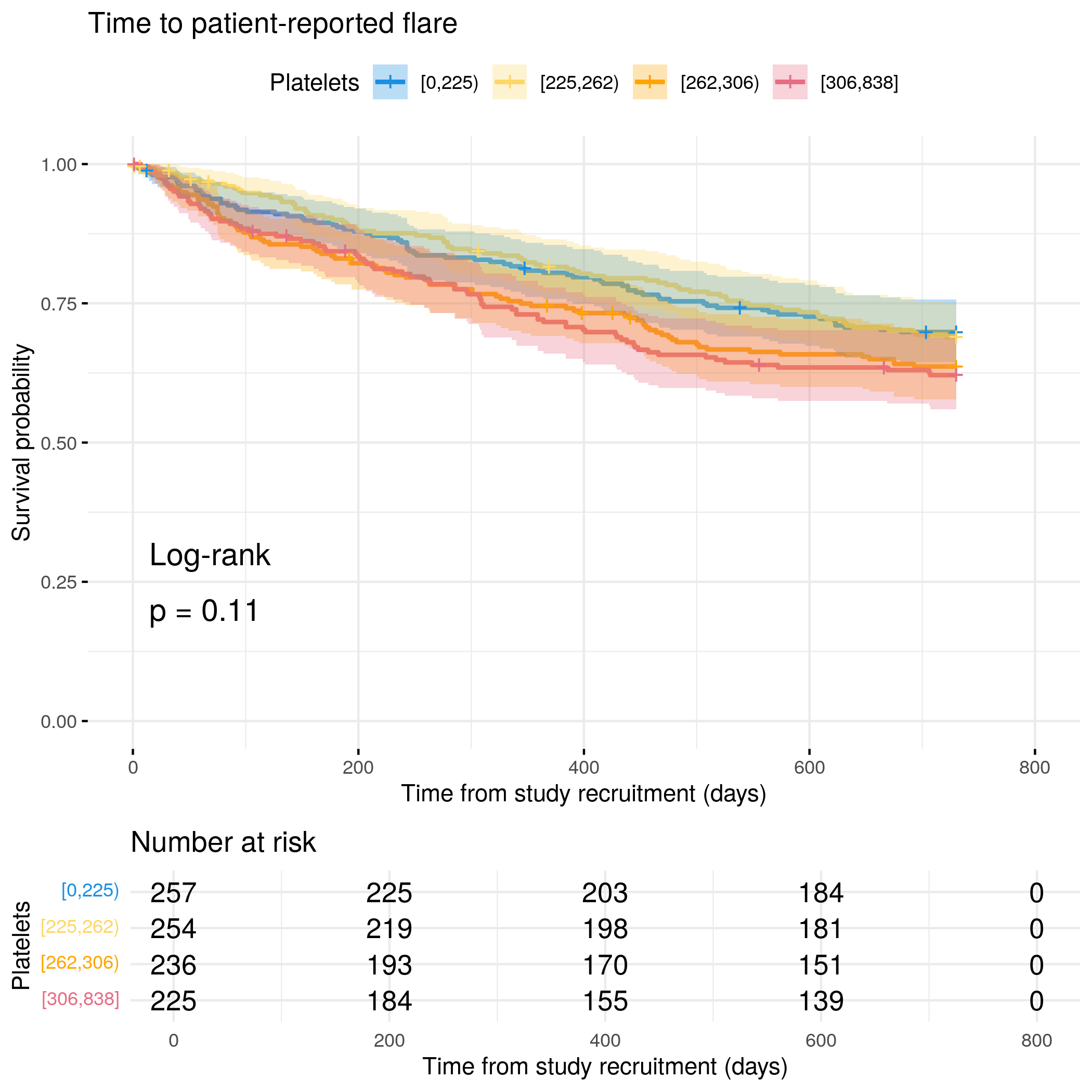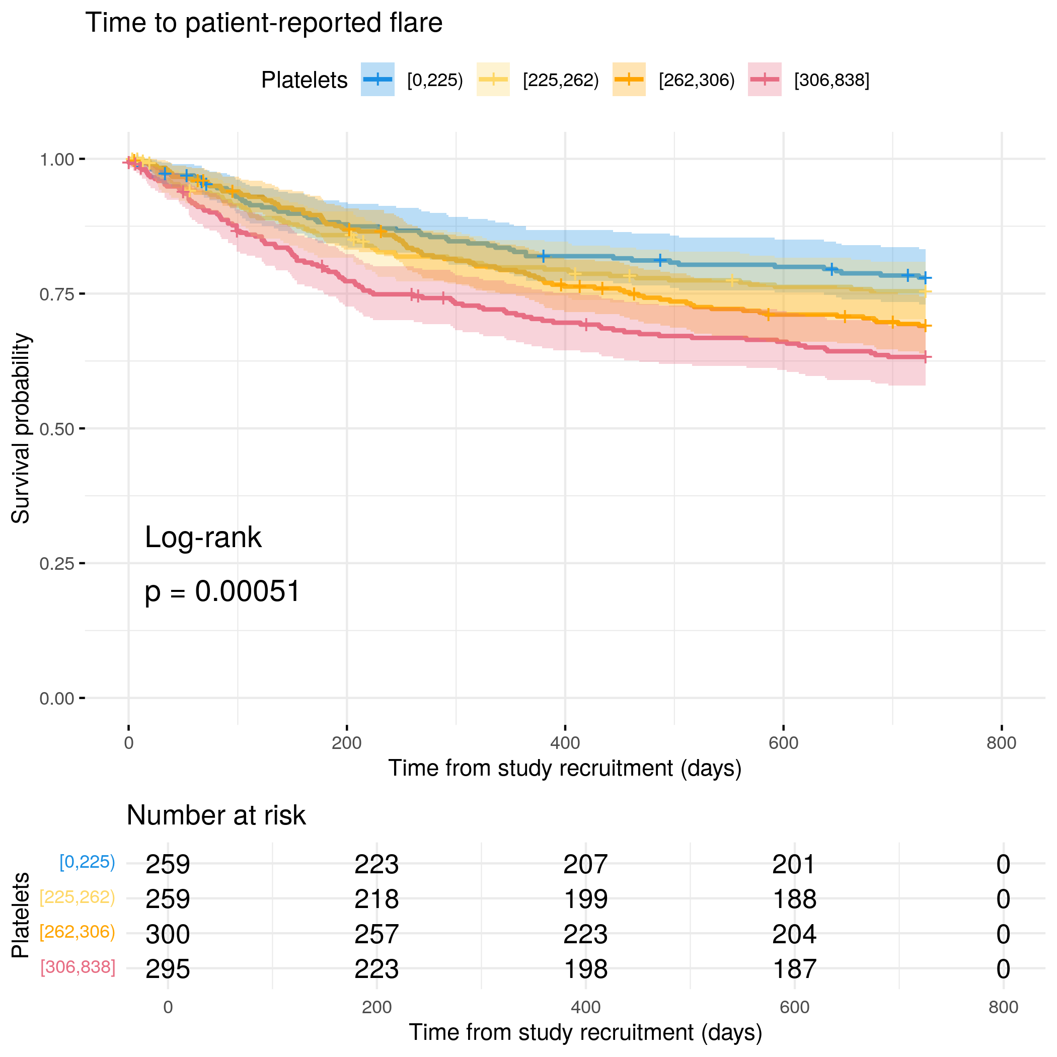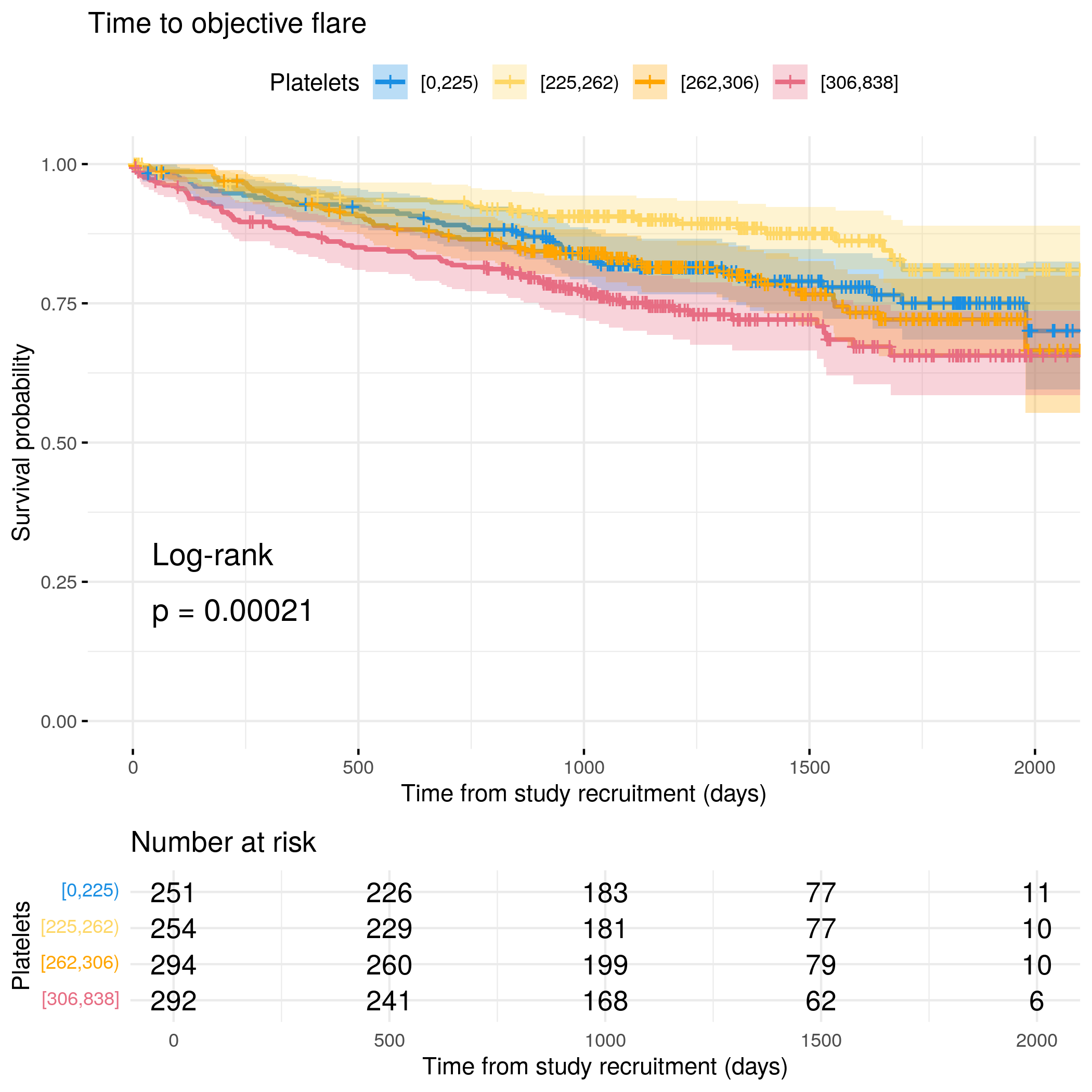 # Generate survival plot and run Cox model for objective flare using utility# functionanalysis_result<-run_survival_analysis( data =flare.cd.df, var_name ="Platelets", outcome_time ="hardflare_time", outcome_event ="hardflare", legend_title ="Platelets", plot_base_path ="plots/cd/hard-flare/biochem/Platelets", break_time_by =500)# Extract hazard ratio for continuous Platelets variablefit.me<-coxph(Surv(hardflare_time, hardflare)~Sex+IMD+cat+Platelets+frailty(SiteNo), control =coxph.control(outer.max =20), data =flare.cd.df)cd.hard.forest<-rbind(cd.hard.forest,get_HR(fit.me, "Platelets"))# Display plot and model summaryknitr::include_graphics("plots/cd/hard-flare/biochem/Platelets.png")