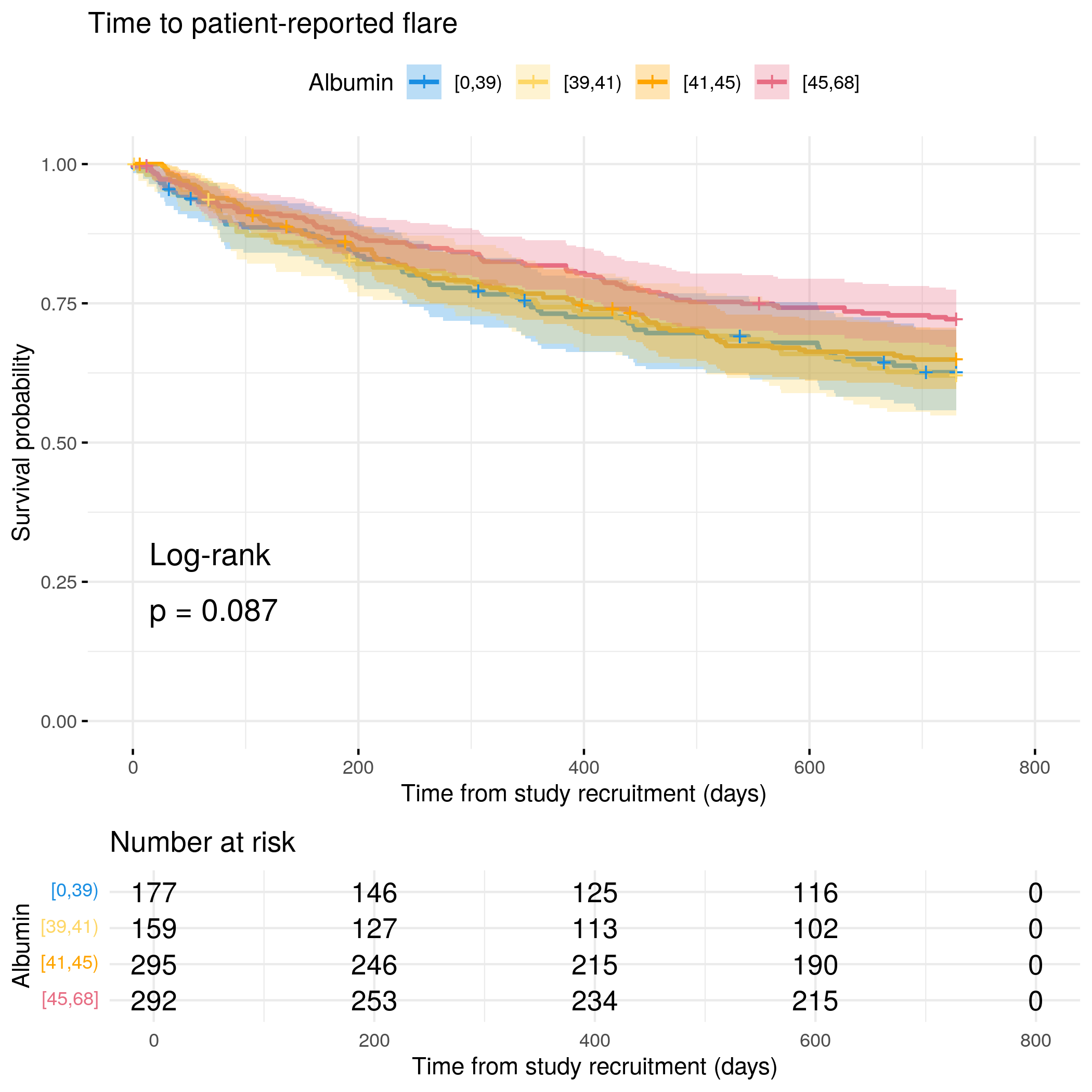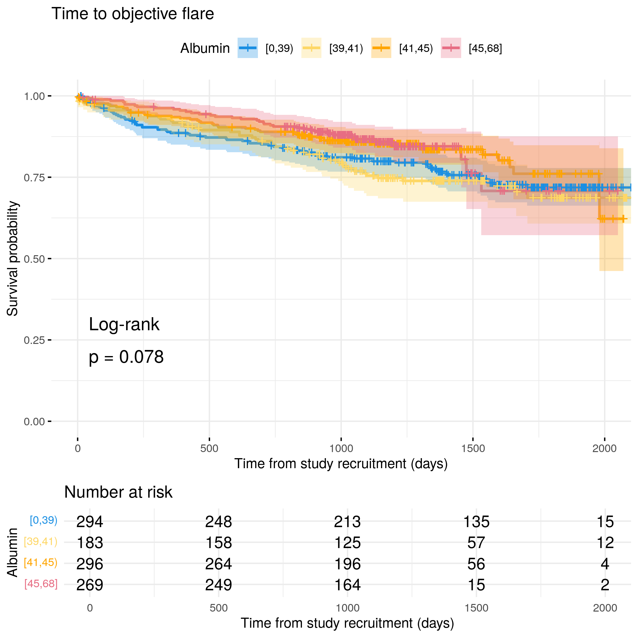 # Generate survival plot and run Cox model for objective flare using utility# functionanalysis_result<-run_survival_analysis( data =flare.cd.df, var_name ="Albumin", outcome_time ="hardflare_time", outcome_event ="hardflare", legend_title ="Albumin", plot_base_path ="plots/cd/hard-flare/biochem/albumin", break_time_by =500)# Extract hazard ratio for continuous Albumin variablefit.me<-coxph(Surv(hardflare_time, hardflare)~Sex+IMD+cat+Albumin+frailty(SiteNo), control =coxph.control(outer.max =20), data =flare.cd.df)cd.hard.forest<-rbind(cd.hard.forest,get_HR(fit.me, "Albumin"))# Display plot and model summaryknitr::include_graphics("plots/cd/hard-flare/biochem/albumin.png")