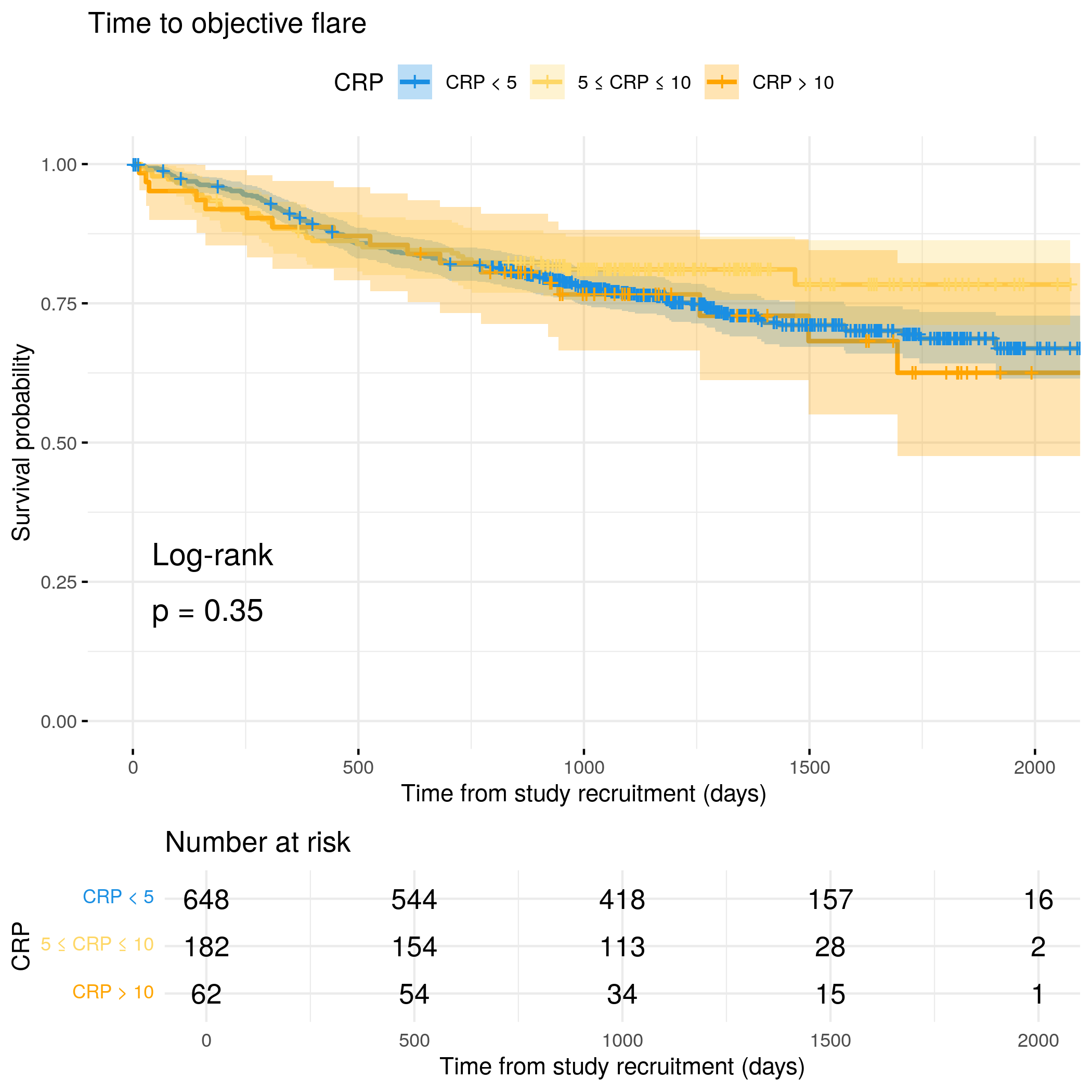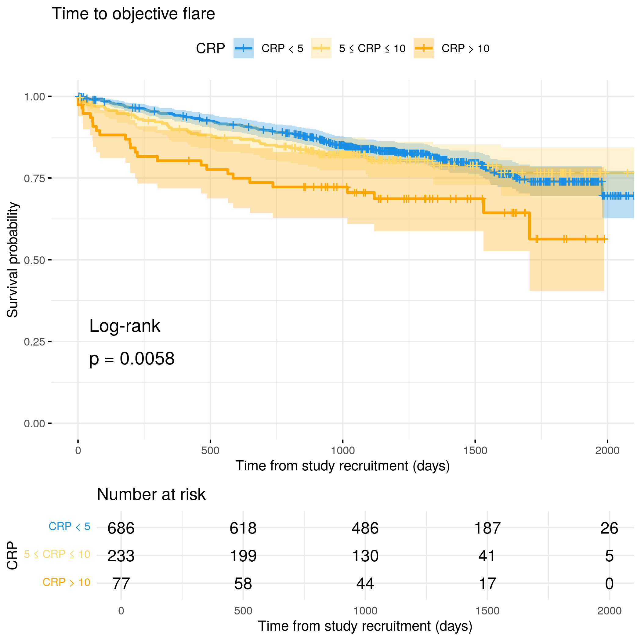 # Generate survival plot and run Cox model for objective flare using utility# functionanalysis_result<-run_survival_analysis( data =flare.uc.df, var_name ="CReactiveProtein", outcome_time ="hardflare_time", outcome_event ="hardflare", legend_title ="CRP", plot_base_path ="plots/uc/hard-flare/biochem/crp", break_time_by =500)# Extract hazard ratio for continuous CRP variablefit.me<-coxph(Surv(hardflare_time, hardflare)~Sex+IMD+cat+CReactiveProtein+frailty(SiteNo), control =coxph.control(outer.max =20), data =flare.uc.df)uc.hard.forest<-rbind(uc.hard.forest,get_HR(fit.me, "CReactiveProtein"))# Display plot and model summaryknitr::include_graphics("plots/uc/hard-flare/biochem/crp.png")