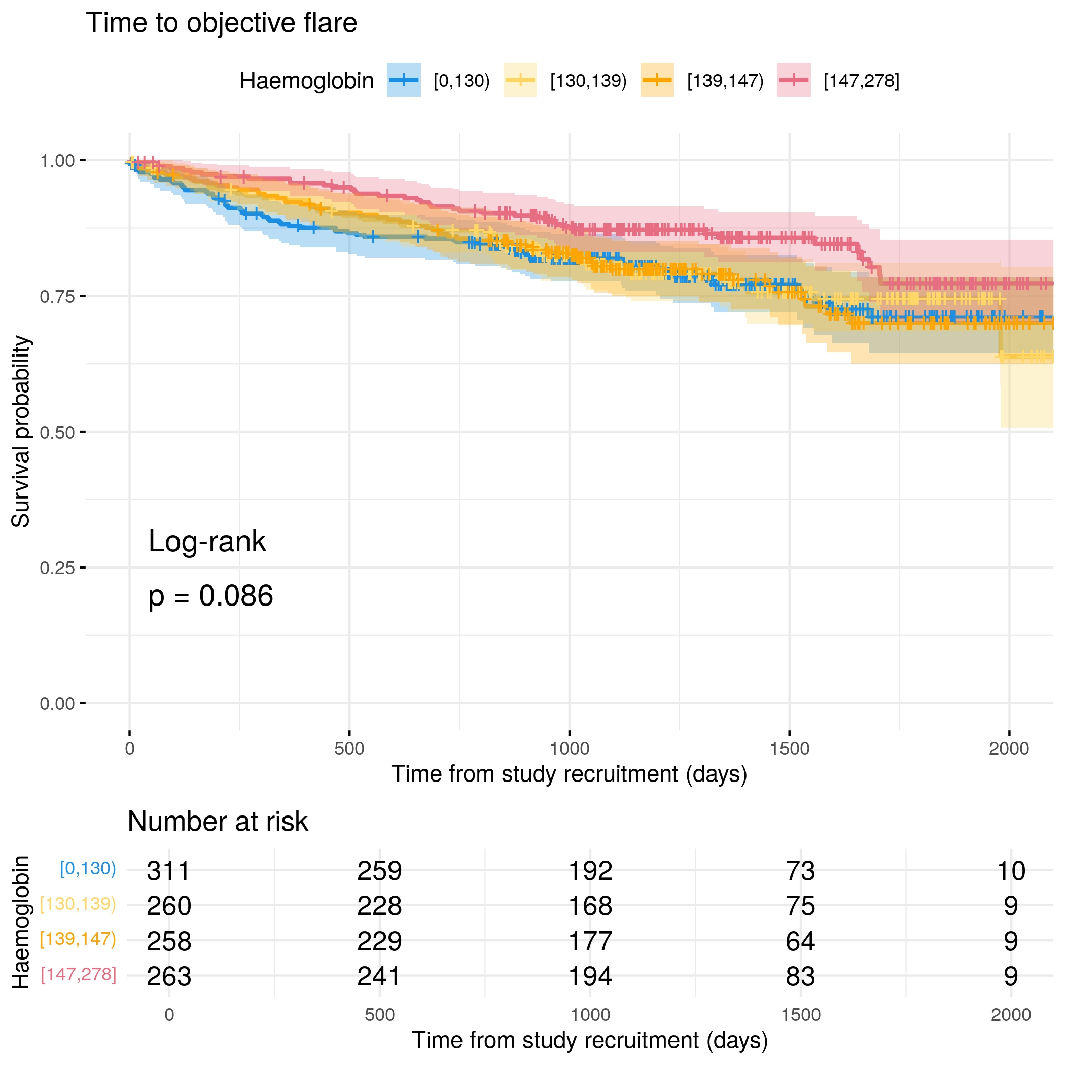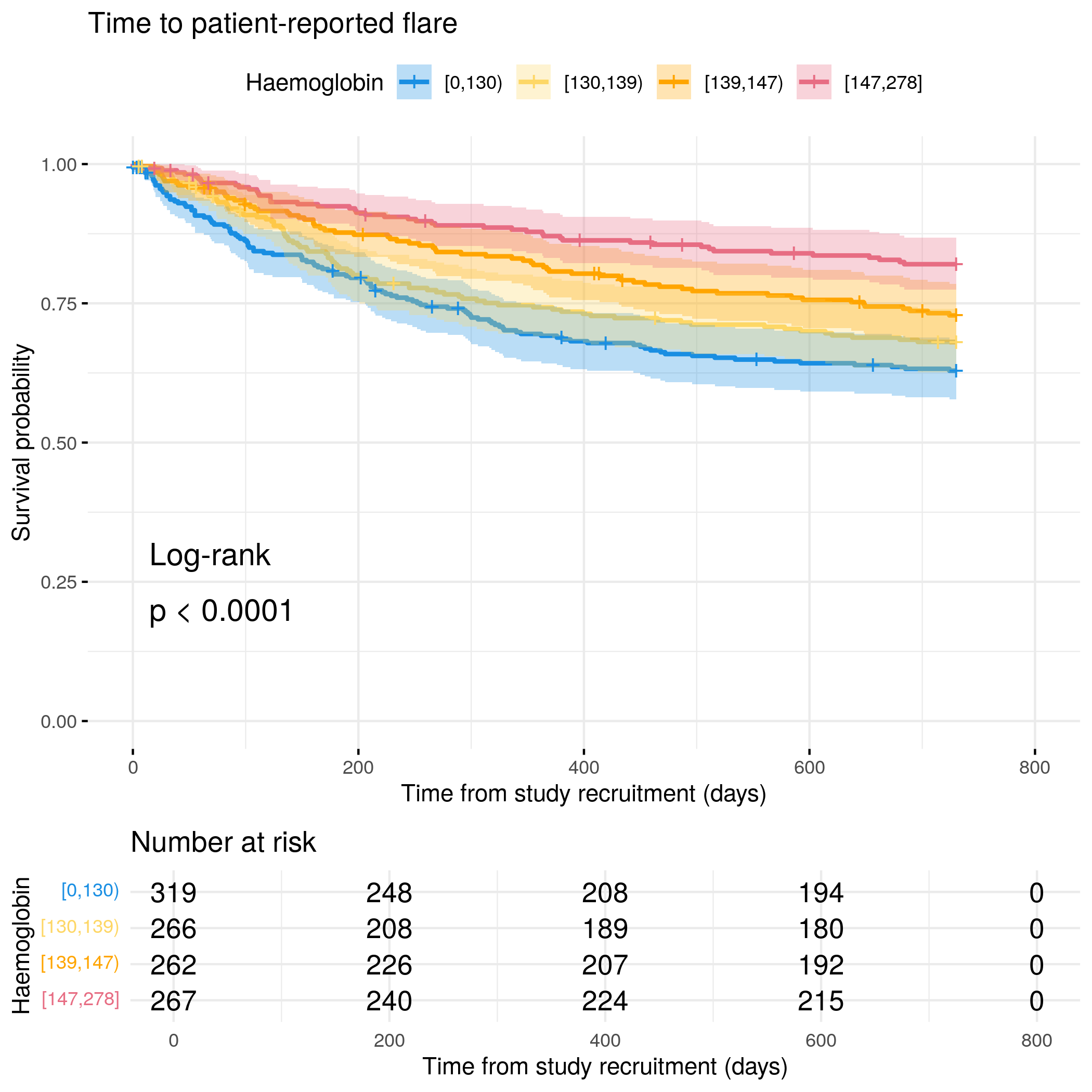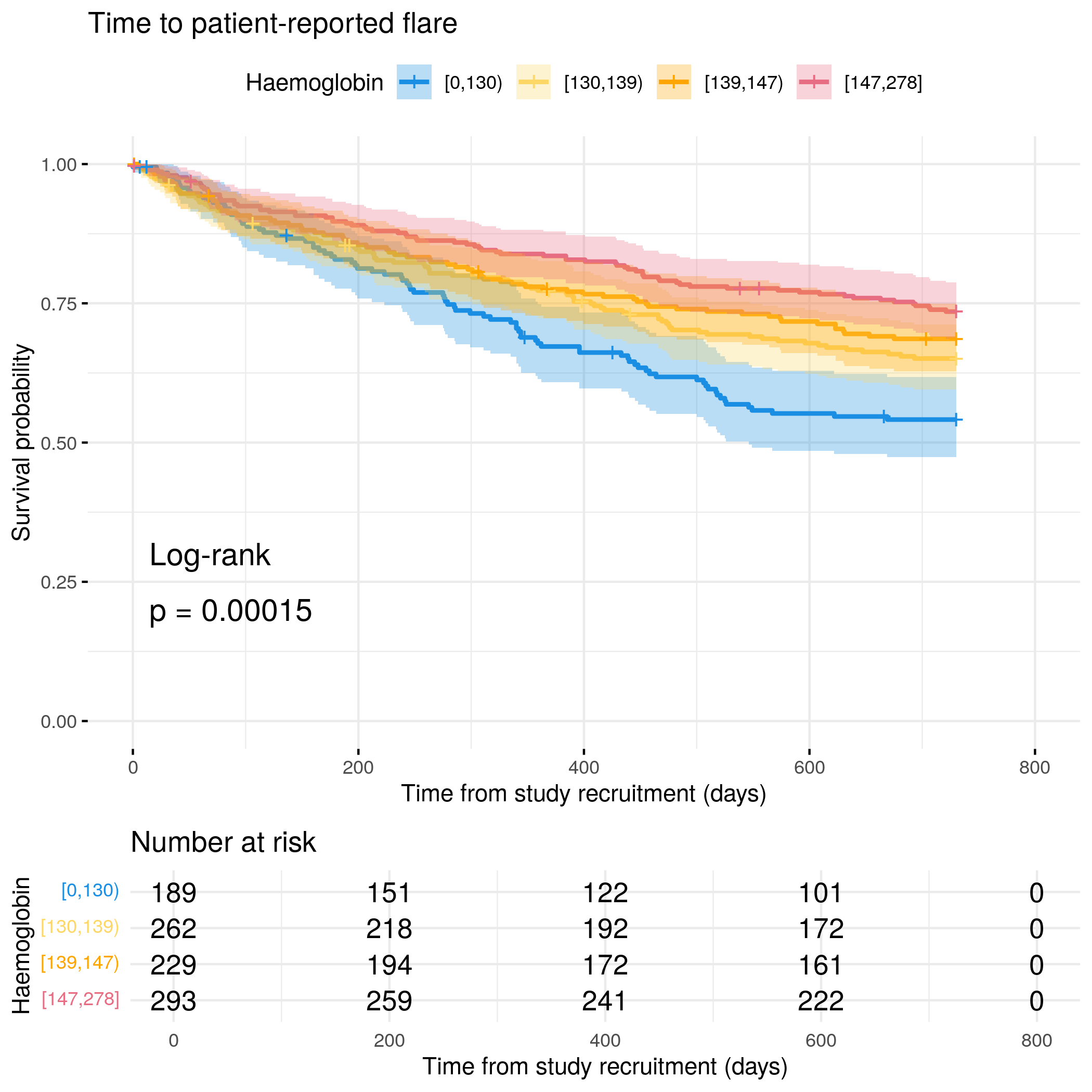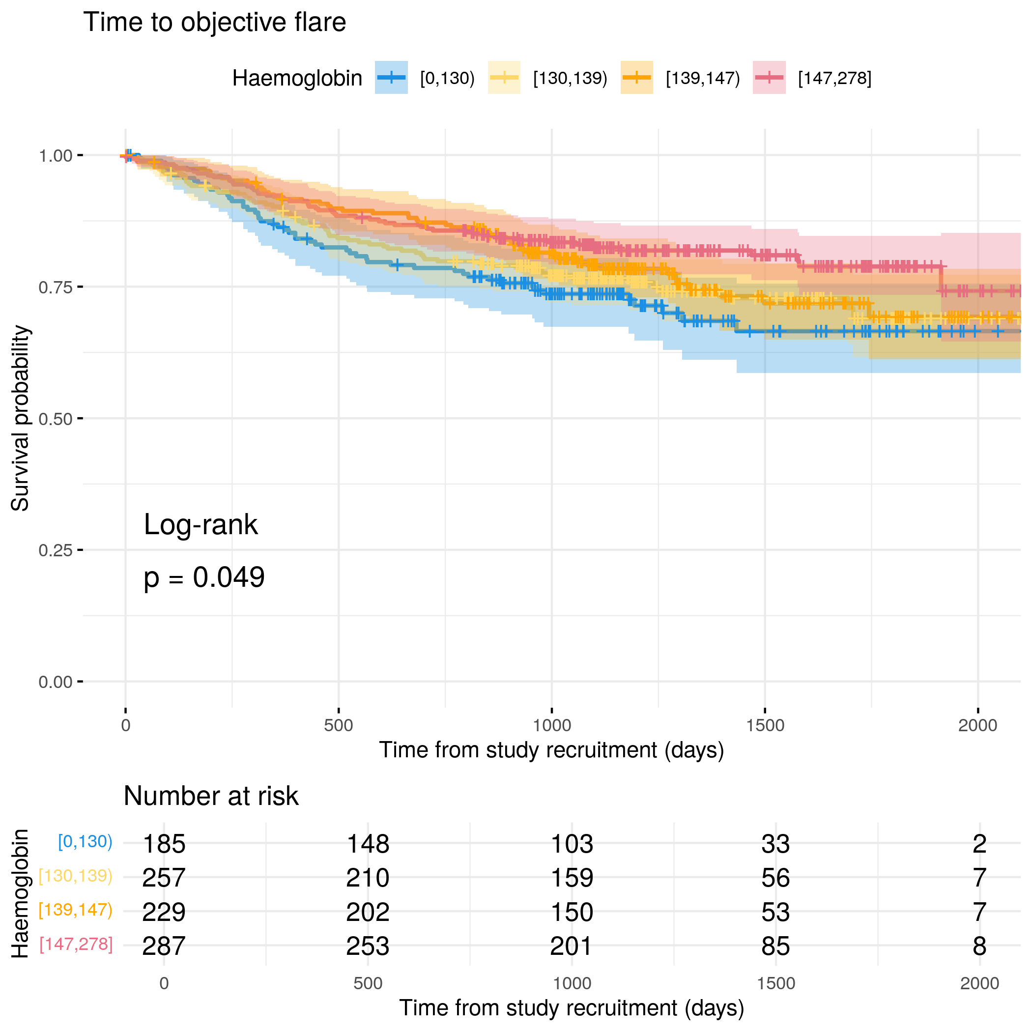 # Generate survival plot and run Cox model for objective flare using utility functionanalysis_result<-run_survival_analysis( data =flare.cd.df, var_name ="Haemoglobin", outcome_time ="hardflare_time", outcome_event ="hardflare", legend_title ="Haemoglobin", plot_base_path ="plots/cd/hard-flare/biochem/haemoglobin", break_time_by =500)# Extract hazard ratio for continuous Haemoglobin variablefit.me<-coxph(Surv(hardflare_time, hardflare)~Sex+IMD+cat+Haemoglobin+frailty(SiteNo), control =coxph.control(outer.max =20), data =flare.cd.df)cd.hard.forest<-rbind(cd.hard.forest,get_HR(fit.me, "Haemoglobin"))# Display plot and model summaryknitr::include_graphics("plots/cd/hard-flare/biochem/haemoglobin.png")