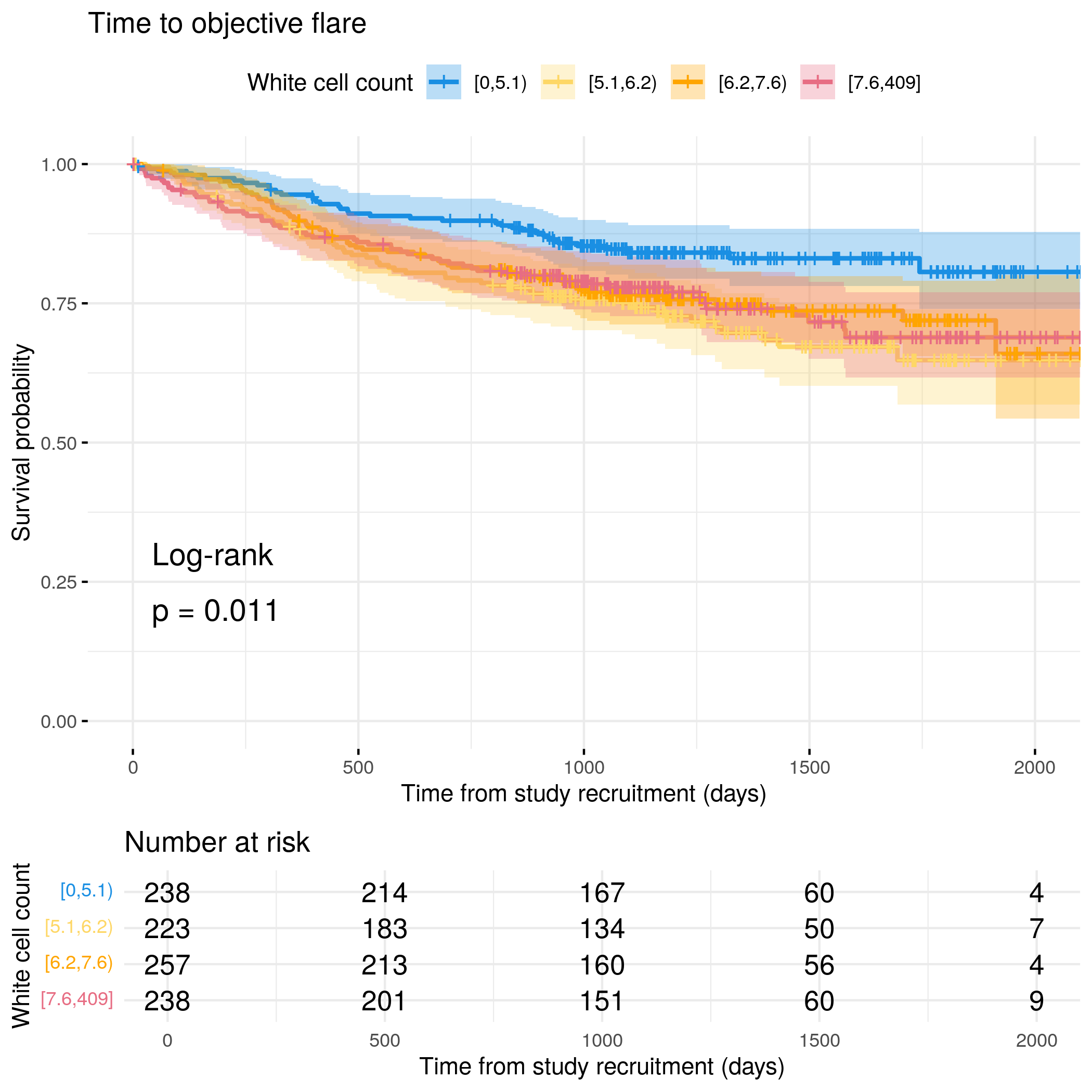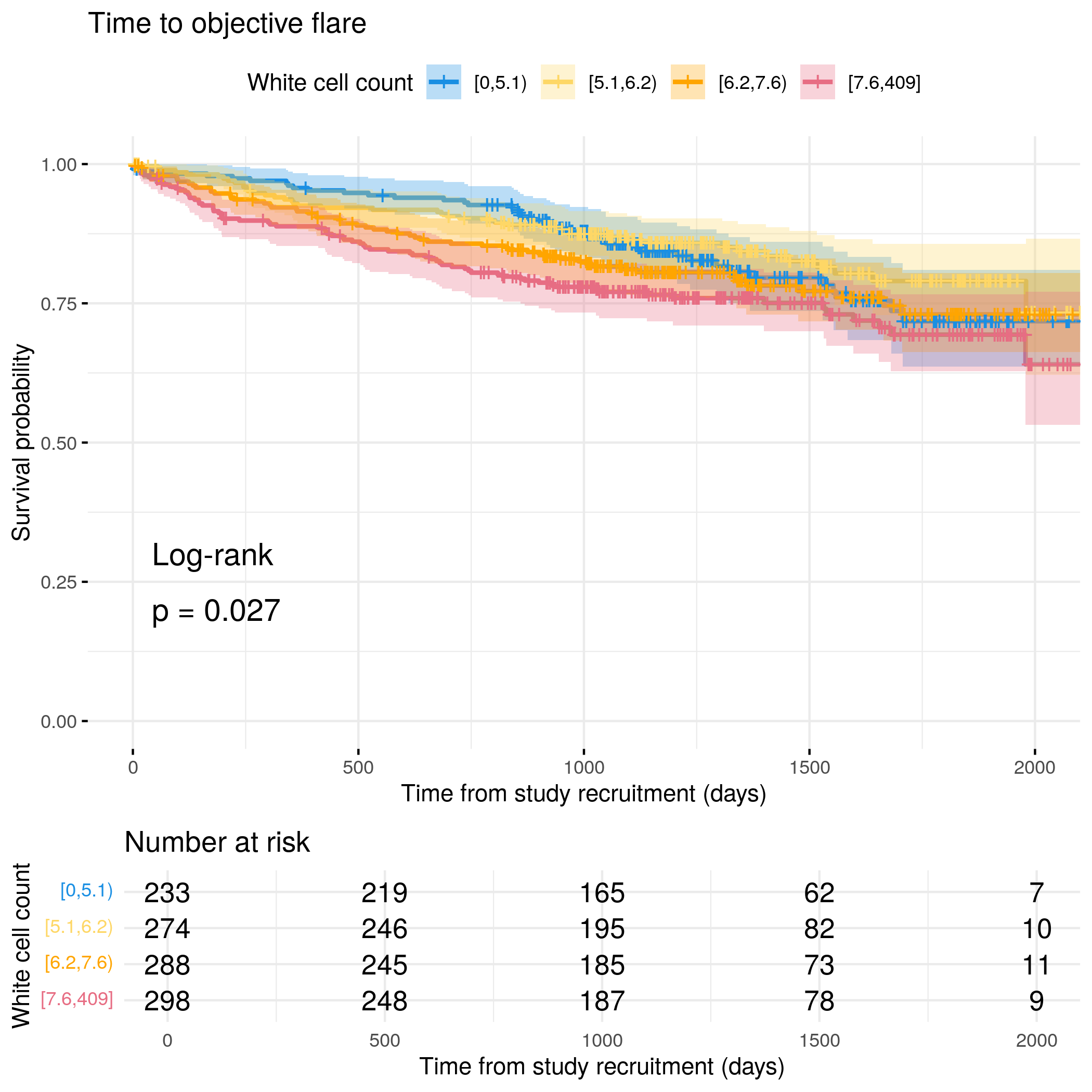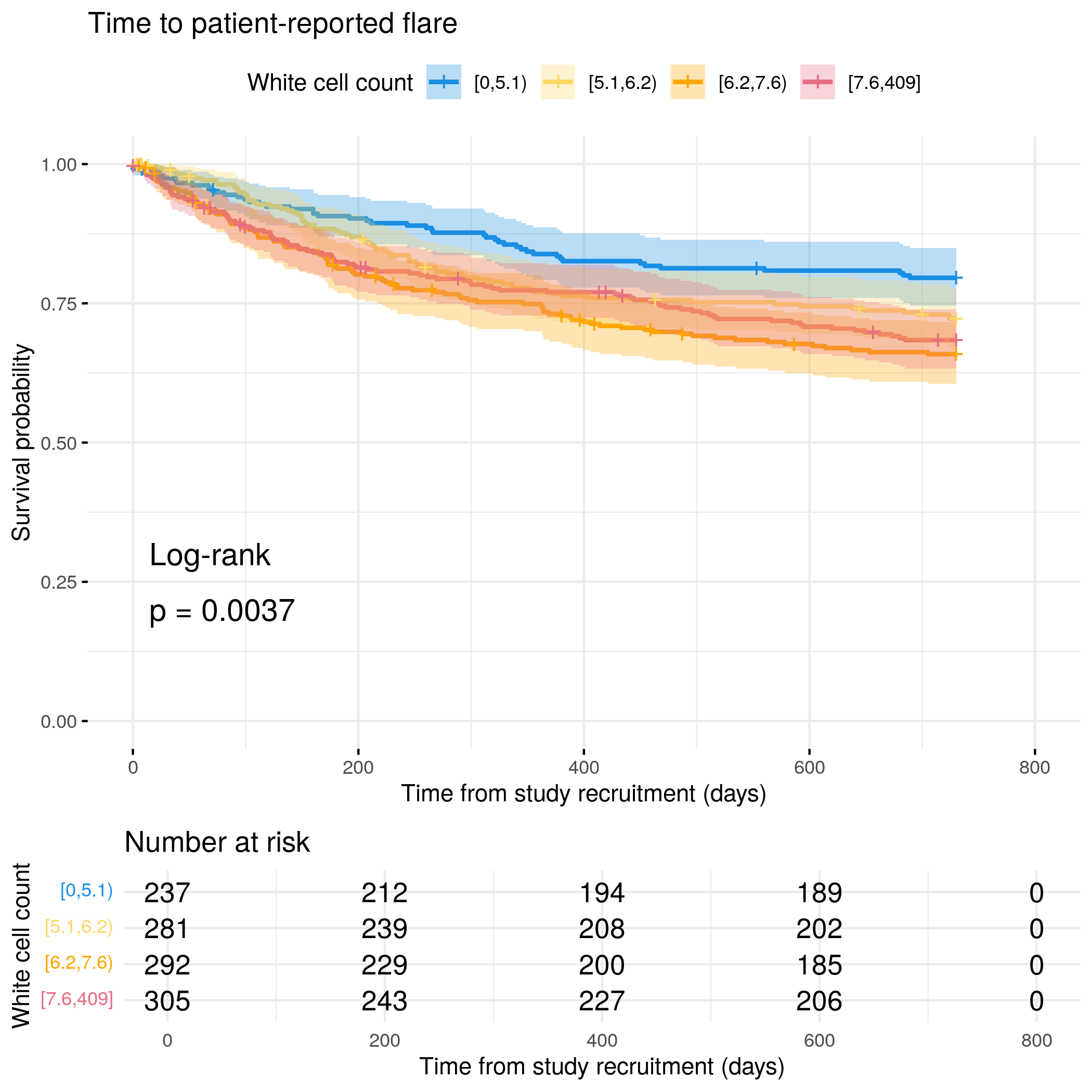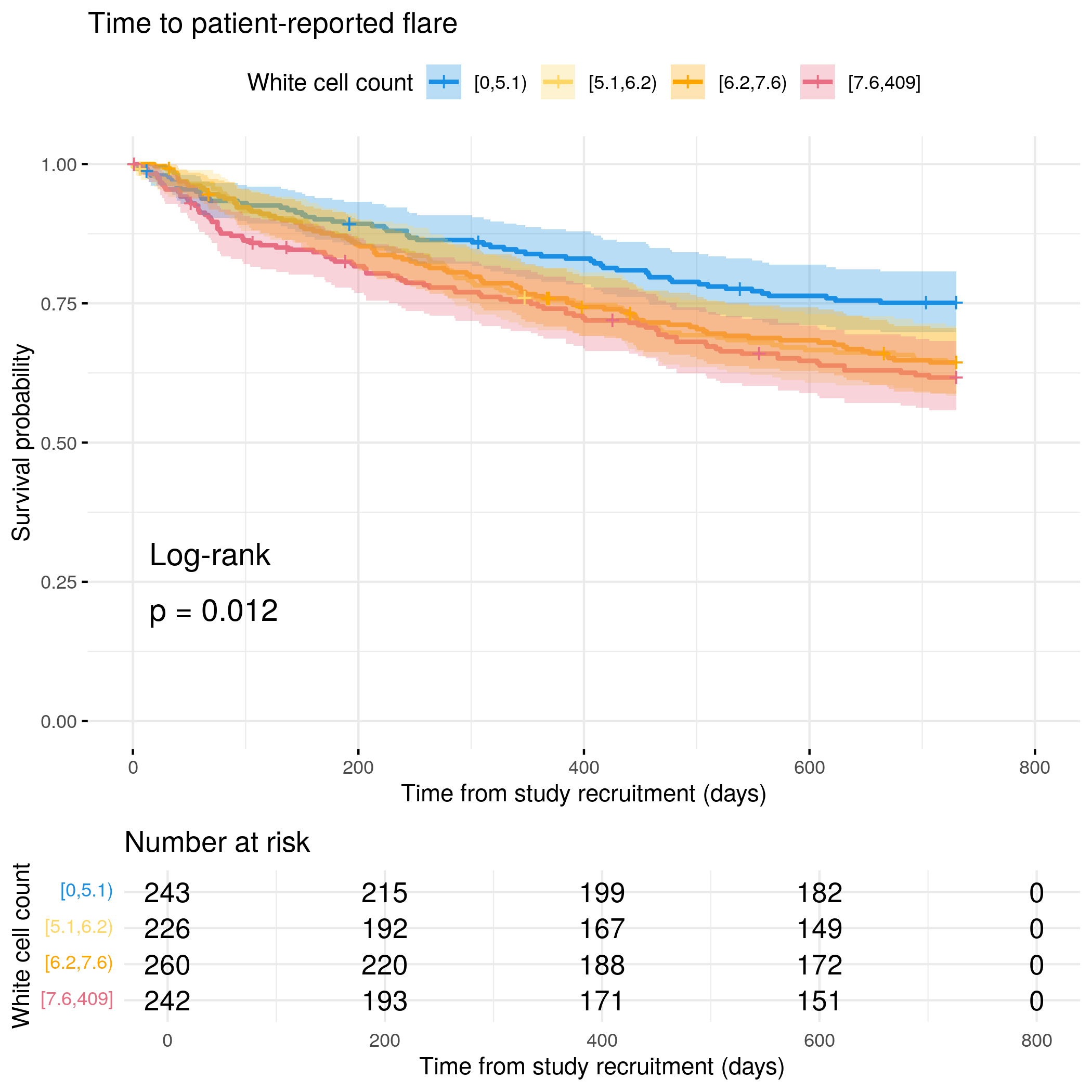 # Categorize White Cell Count by quantilesflare.uc.df<-categorize_by_quantiles(flare.uc.df,"WCC", reference_data =flare.df)# Run survival analysis using utility functionanalysis_result<-run_survival_analysis( data =flare.uc.df, var_name ="WCC", outcome_time ="softflare_time", outcome_event ="softflare", legend_title ="White cell count", plot_base_path ="plots/uc/soft-flare/biochem/wcc", break_time_by =200)# Extract hazard ratio for continuous WCC variablefit.me<-coxph(Surv(softflare_time, softflare)~Sex+IMD+cat+WCC+frailty(SiteNo), control =coxph.control(outer.max =20), data =flare.uc.df)uc.clin.forest<-rbind(uc.clin.forest,get_HR(fit.me, "WCC"))# Display plot and model summaryknitr::include_graphics("plots/uc/soft-flare/biochem/wcc.png")