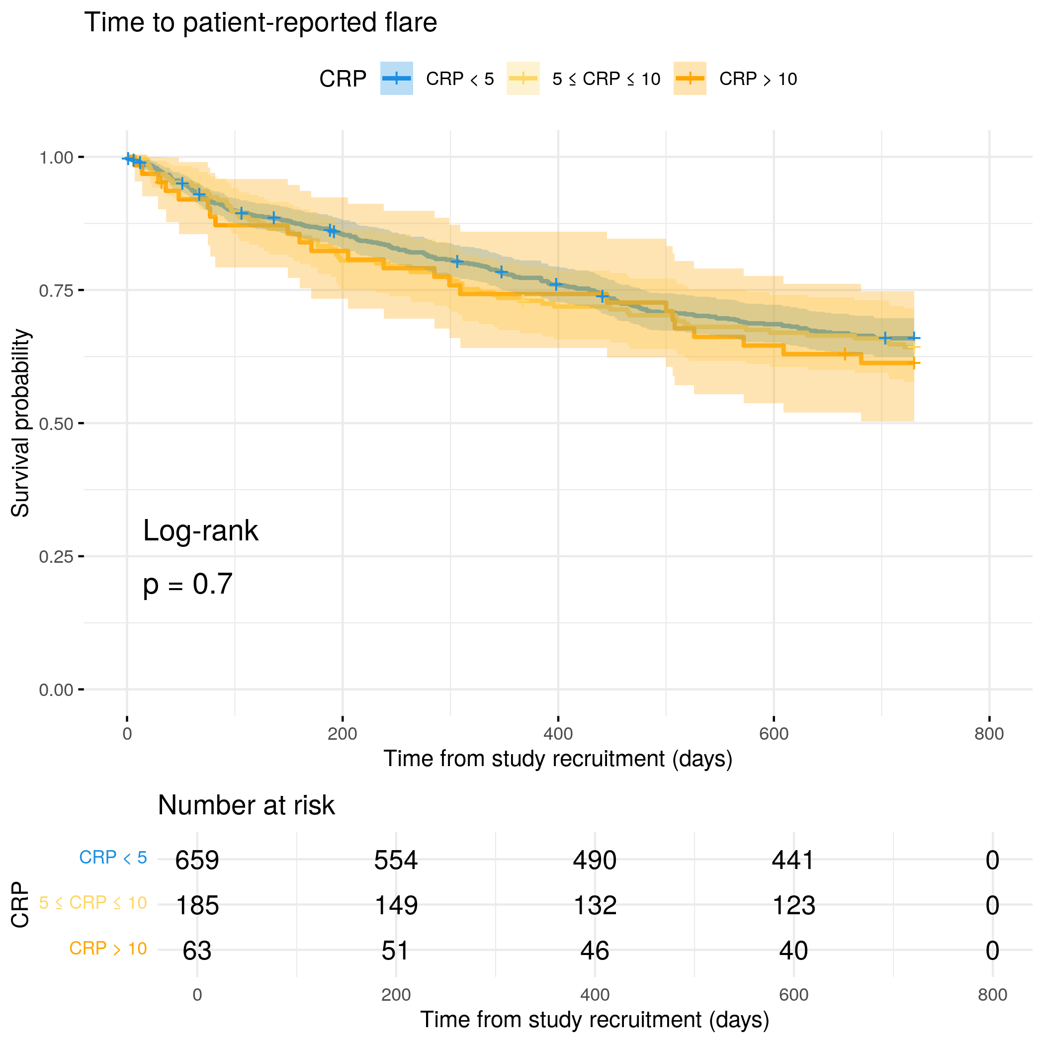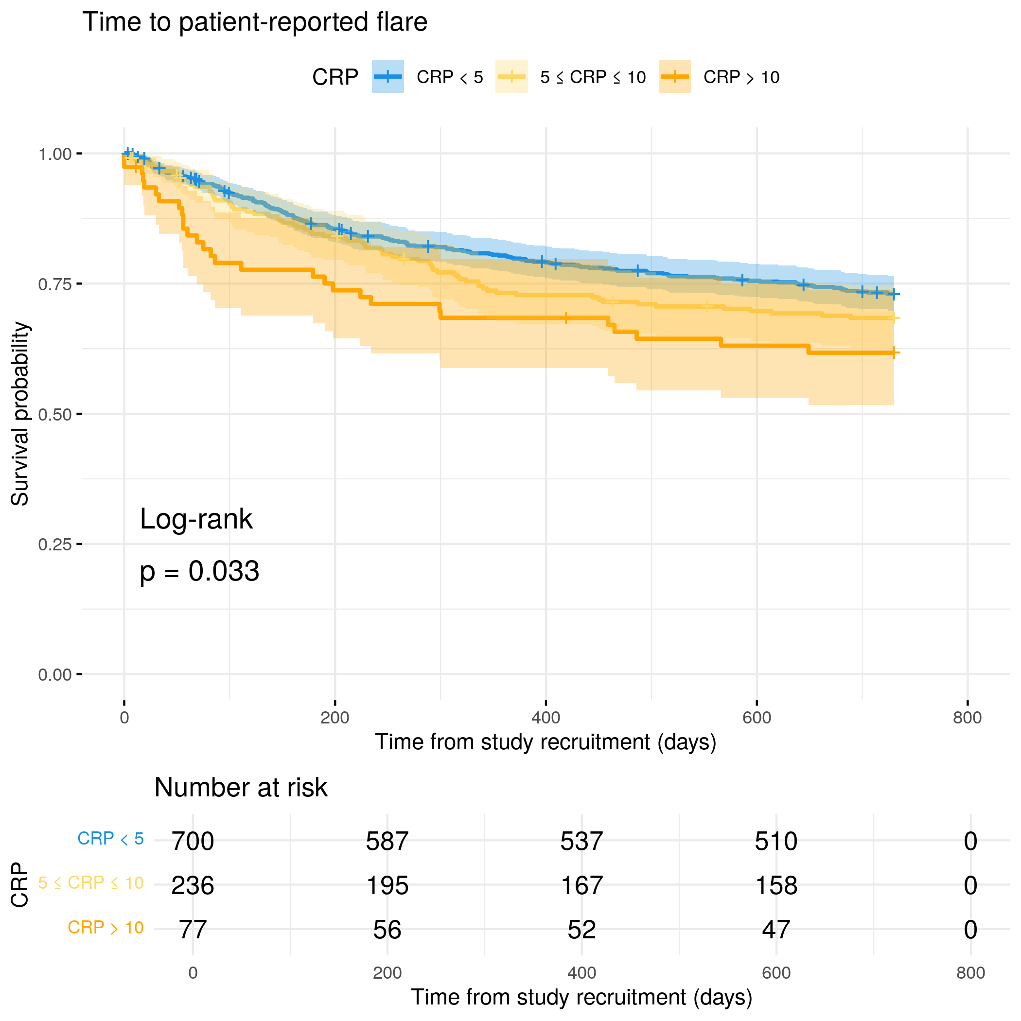 # Generate survival plot and run Cox model for objective flare using utility# functionanalysis_result<-run_survival_analysis( data =flare.cd.df, var_name ="CReactiveProtein", outcome_time ="hardflare_time", outcome_event ="hardflare", legend_title ="CRP", plot_base_path ="plots/cd/hard-flare/biochem/crp", break_time_by =500)# Extract hazard ratio for continuous CRP variablefit.me<-coxph(Surv(hardflare_time, hardflare)~Sex+IMD+cat+CReactiveProtein+frailty(SiteNo), control =coxph.control(outer.max =20), data =flare.cd.df)cd.hard.forest<-rbind(cd.hard.forest,get_HR(fit.me, "CReactiveProtein"))# Display plot and model summaryknitr::include_graphics("plots/cd/hard-flare/biochem/crp.png")