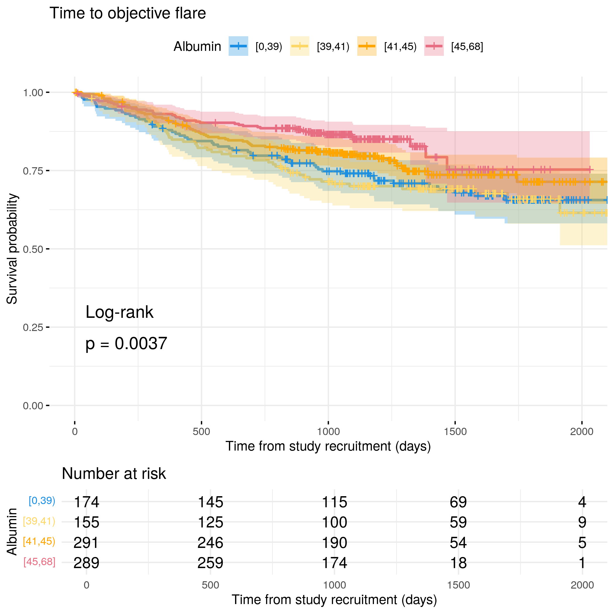 # Generate survival plot and run Cox model for objective flare using utility# functionanalysis_result<-run_survival_analysis( data =flare.uc.df, var_name ="Albumin", outcome_time ="hardflare_time", outcome_event ="hardflare", legend_title ="Albumin", plot_base_path ="plots/uc/hard-flare/biochem/albumin", break_time_by =500)# Extract hazard ratio for continuous Albumin variablefit.me<-coxph(Surv(hardflare_time, hardflare)~Sex+IMD+cat+Albumin+frailty(SiteNo), control =coxph.control(outer.max =20), data =flare.uc.df)uc.hard.forest<-rbind(uc.hard.forest,get_HR(fit.me, "Albumin"))# Display plot and model summaryknitr::include_graphics("plots/uc/hard-flare/biochem/albumin.png")