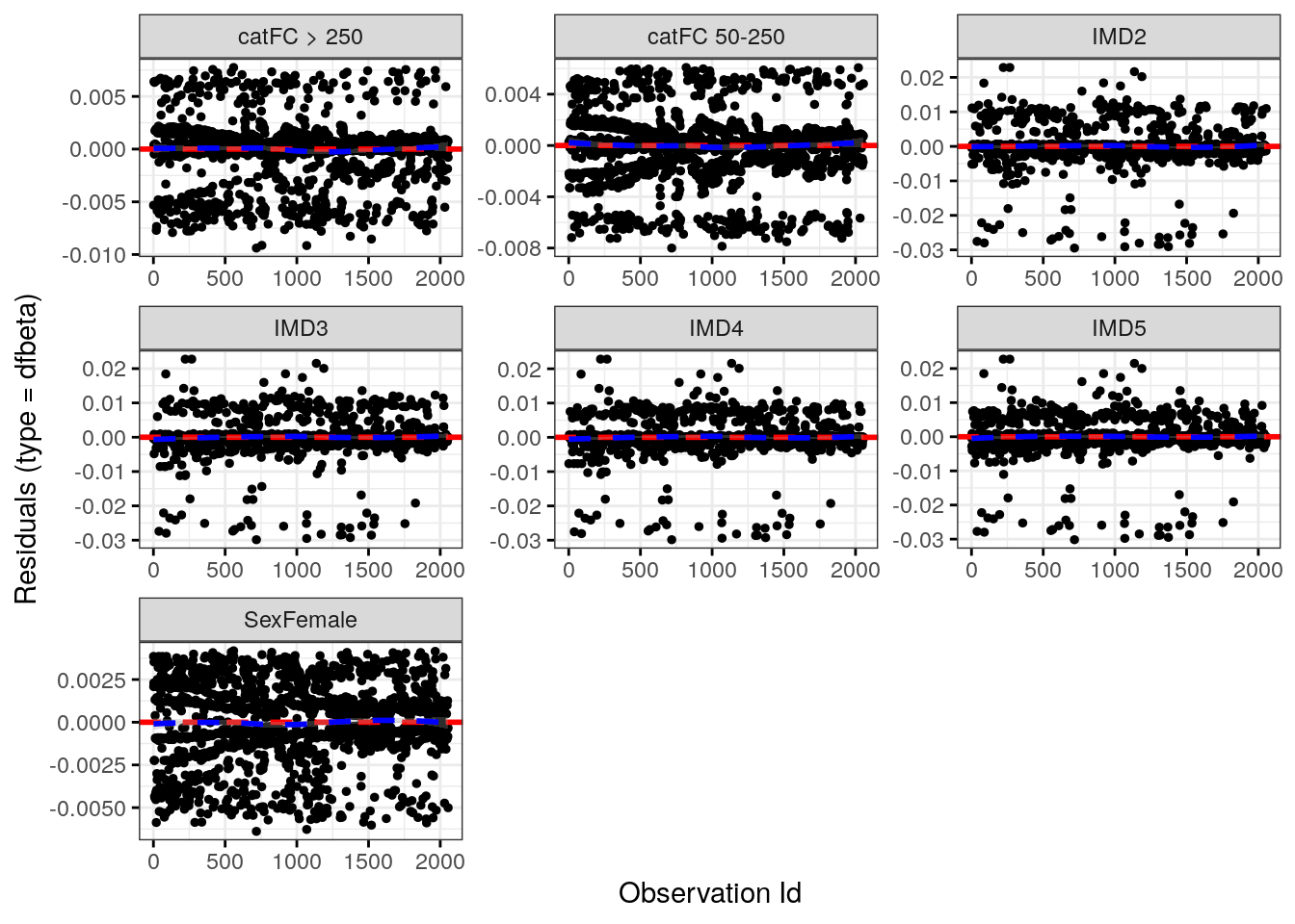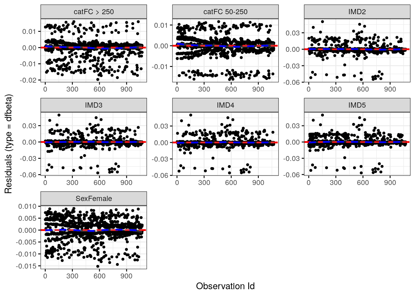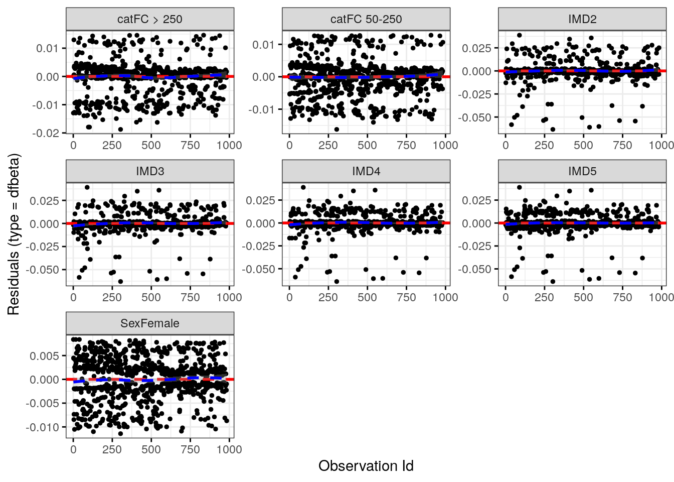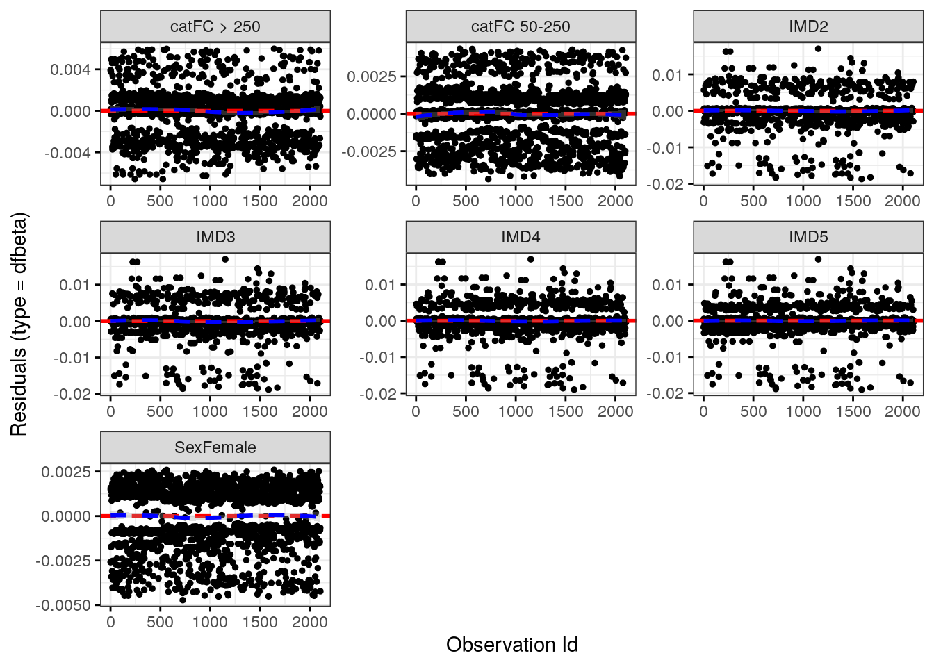 fit.me<-coxph(Surv(softflare_time, softflare)~Sex+IMD+cat+Smoke+frailty(SiteNo), control =coxph.control(outer.max =20), data =flare.cd.df, model =TRUE)cd.clin.forest<-get_HR(fit.me,c("SmokePrevious", "SmokeNever"))fit.me<-coxph(Surv(softflare_time, softflare)~Sex+IMD+cat+frailty(SiteNo), control =coxph.control(outer.max =20), data =flare.cd.df, model =TRUE)cd.clin.forest<-rbind(cd.clin.forest,get_HR(fit.me,c("SexFemale",paste0("IMD", seq(2, 5)),"catFC 50-250","catFC > 250")))invisible(cox_summary(fit.me))