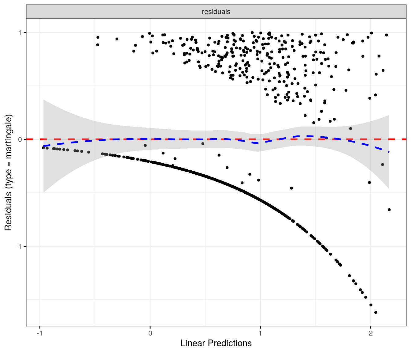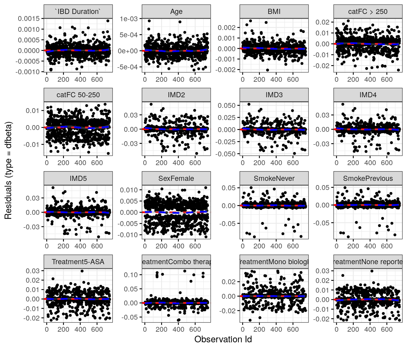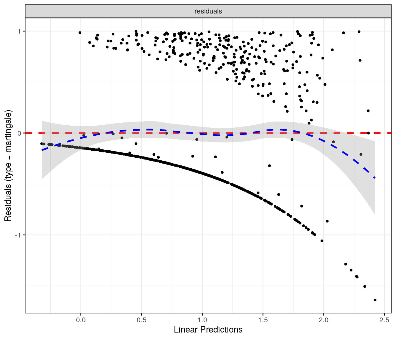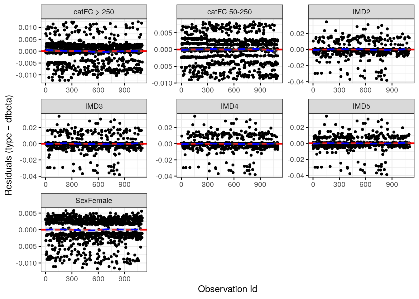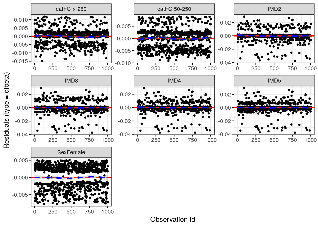 fit.me<-coxph(Surv(softflare_time, softflare)~Sex+IMD+cat+Smoke+frailty(SiteNo), control =coxph.control(outer.max =20), data =flare.cd.df, model =TRUE)cd.clin.forest<-get_HR(fit.me,c("SmokePrevious", "SmokeNever"))fit.me<-coxph(Surv(softflare_time, softflare)~Sex+IMD+cat+frailty(SiteNo), control =coxph.control(outer.max =20), data =flare.cd.df, model =TRUE)cd.clin.forest<-rbind(cd.clin.forest,get_HR(fit.me,c("SexFemale",paste0("IMD", seq(2, 5)),"catFC 50-250","catFC > 250")))invisible(cox_summary(fit.me))