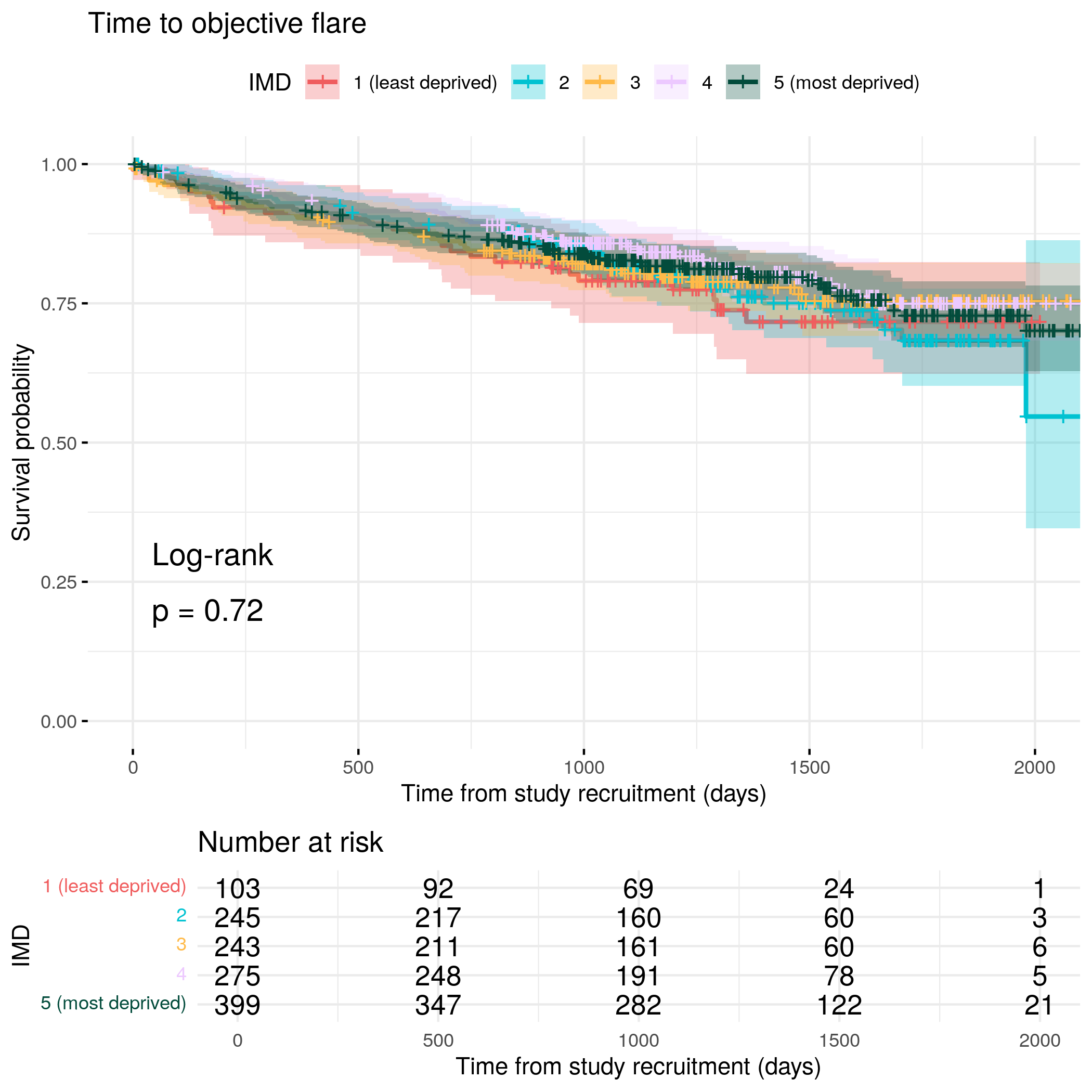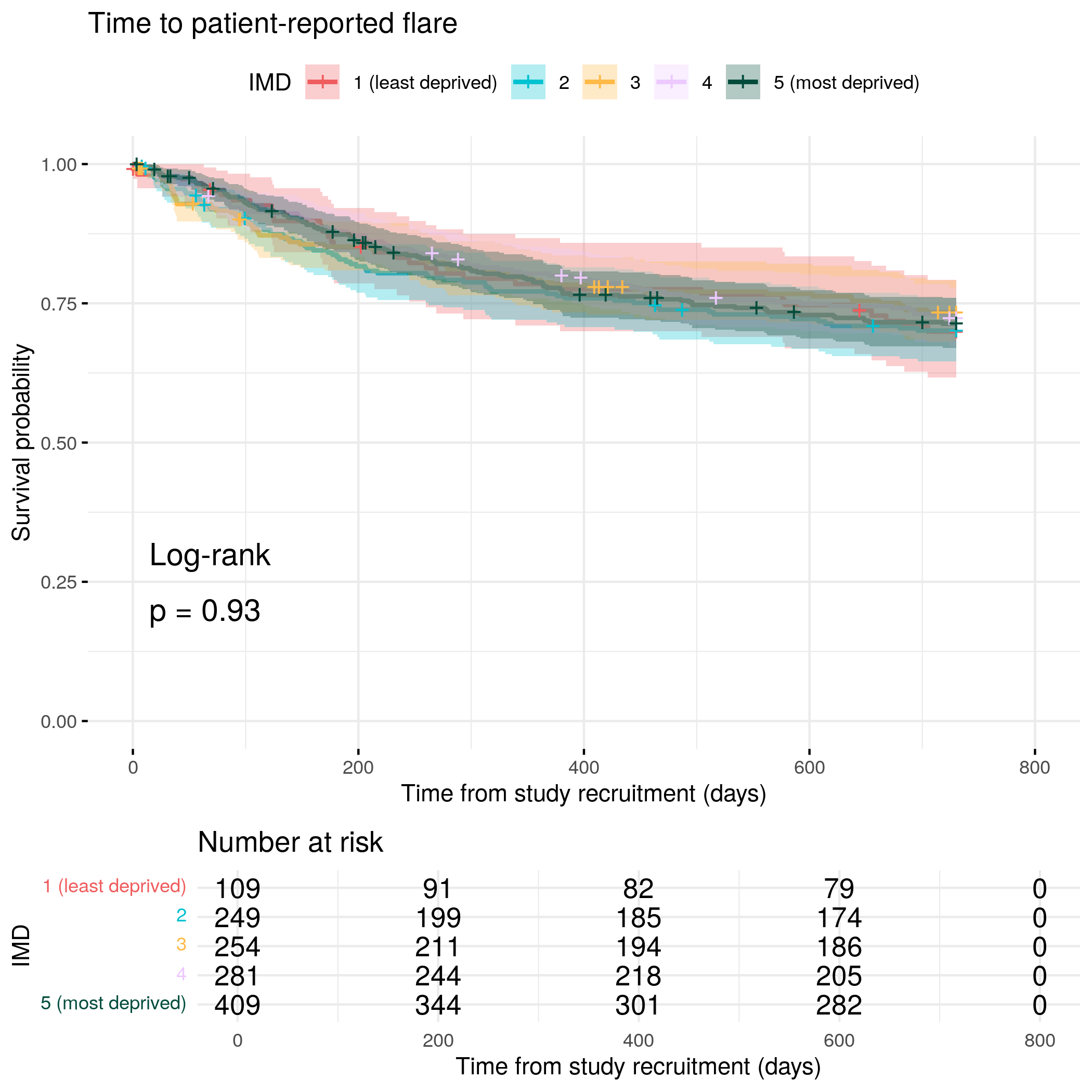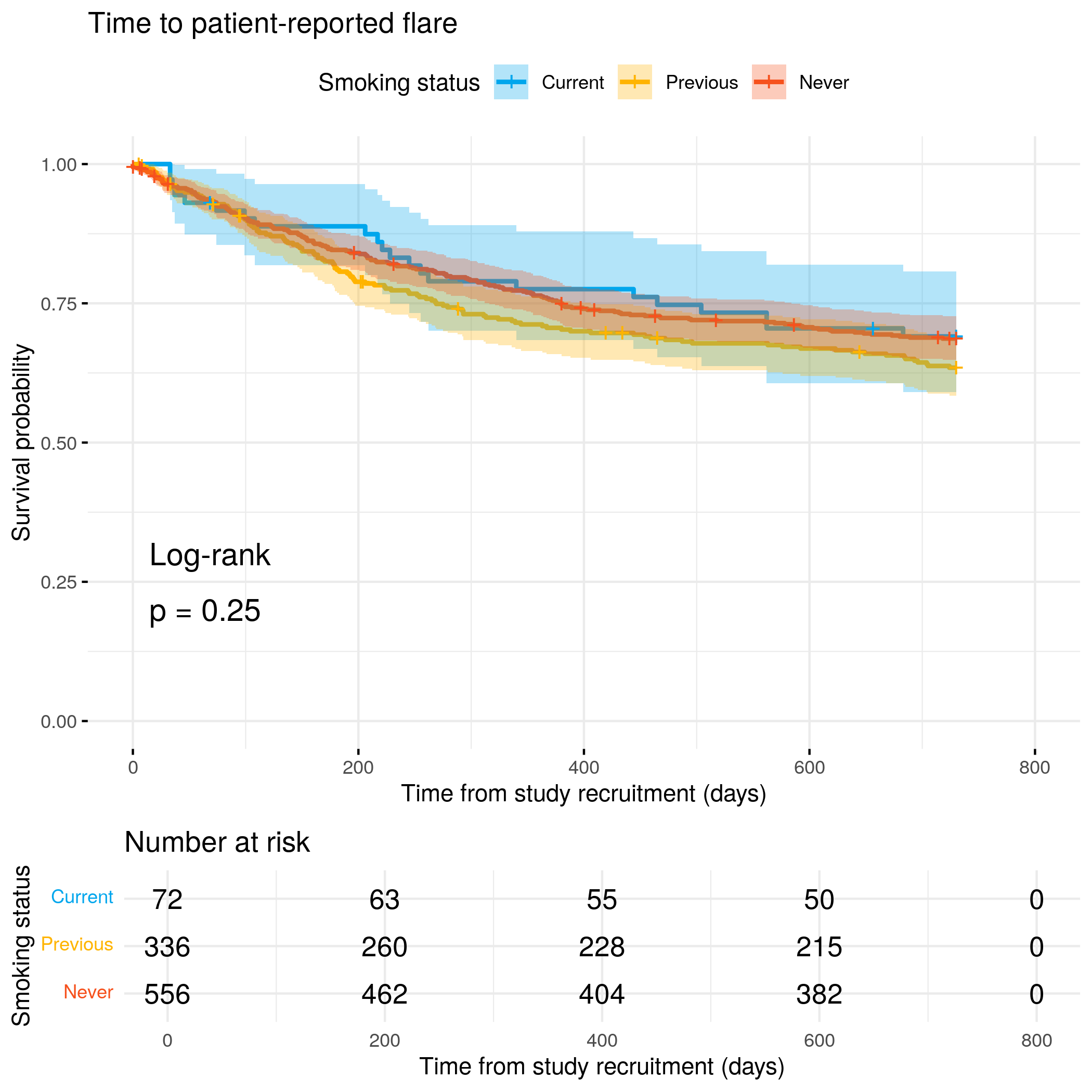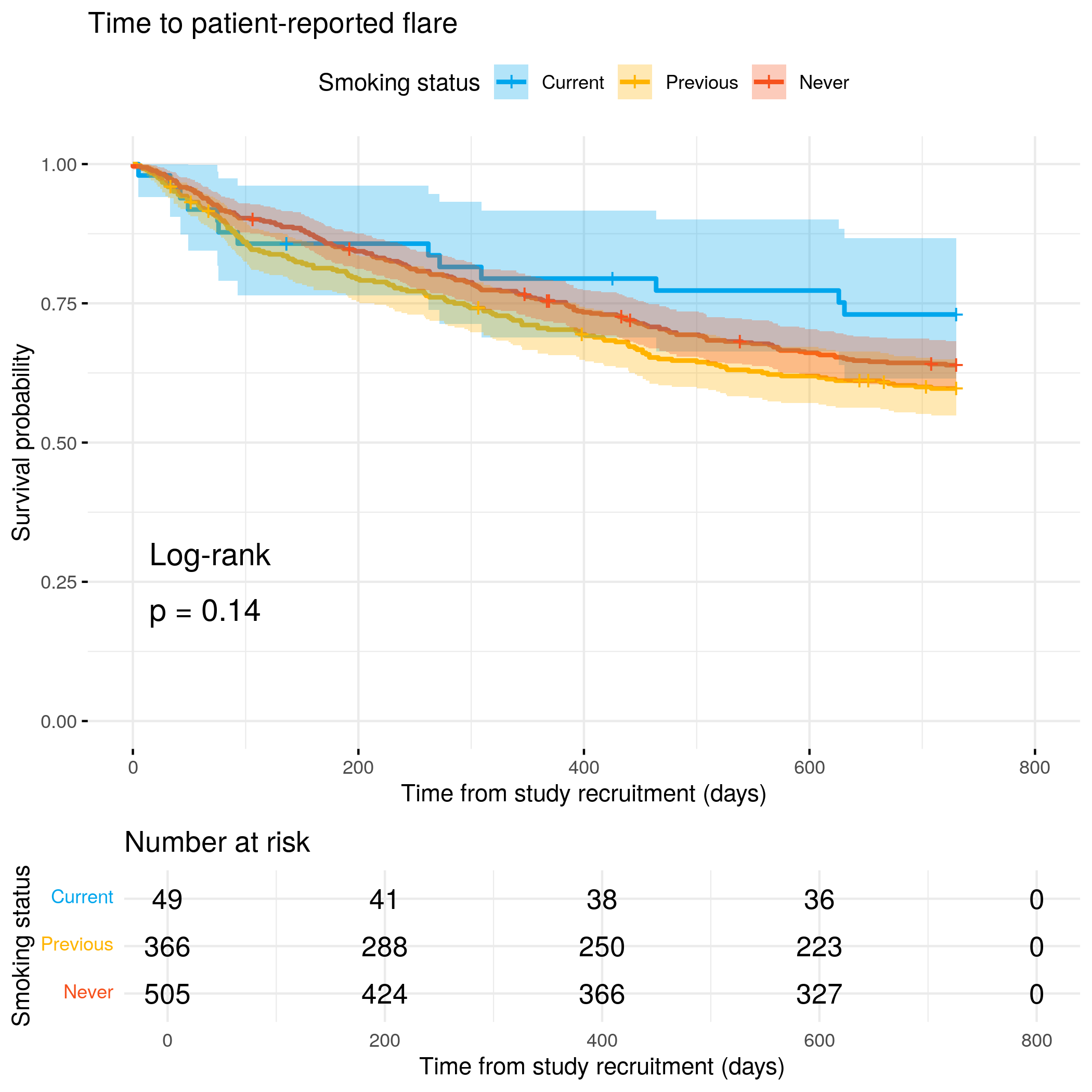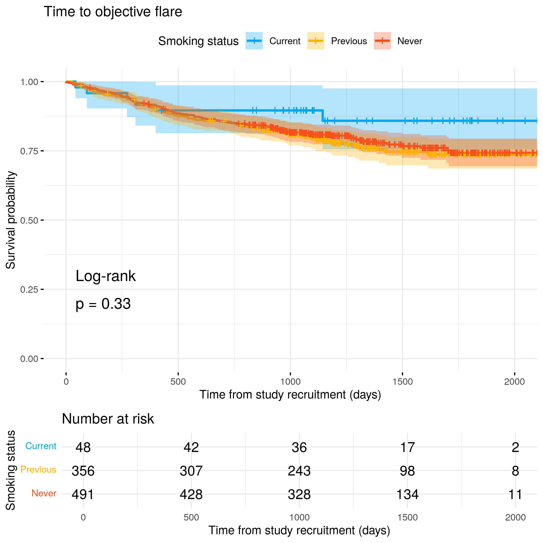fit.me<-coxph(Surv(hardflare_time, hardflare)~Sex+IMD+cat+Smoke+frailty(SiteNo), control =coxph.control(outer.max =20), data =flare.cd.df)cd.hard.forest<-get_HR(fit.me,c("SmokePrevious", "SmokeNever"))fit.me<-coxph(Surv(hardflare_time, hardflare)~Sex+IMD+cat+frailty(SiteNo), control =coxph.control(outer.max =20), data =flare.cd.df)cd.hard.forest<-rbind(cd.hard.forest,get_HR(fit.me,c("SexFemale",paste0("IMD", seq(2, 5)),"catFC > 250")))invisible(cox_summary(fit.me))