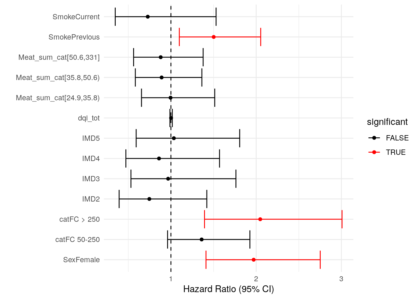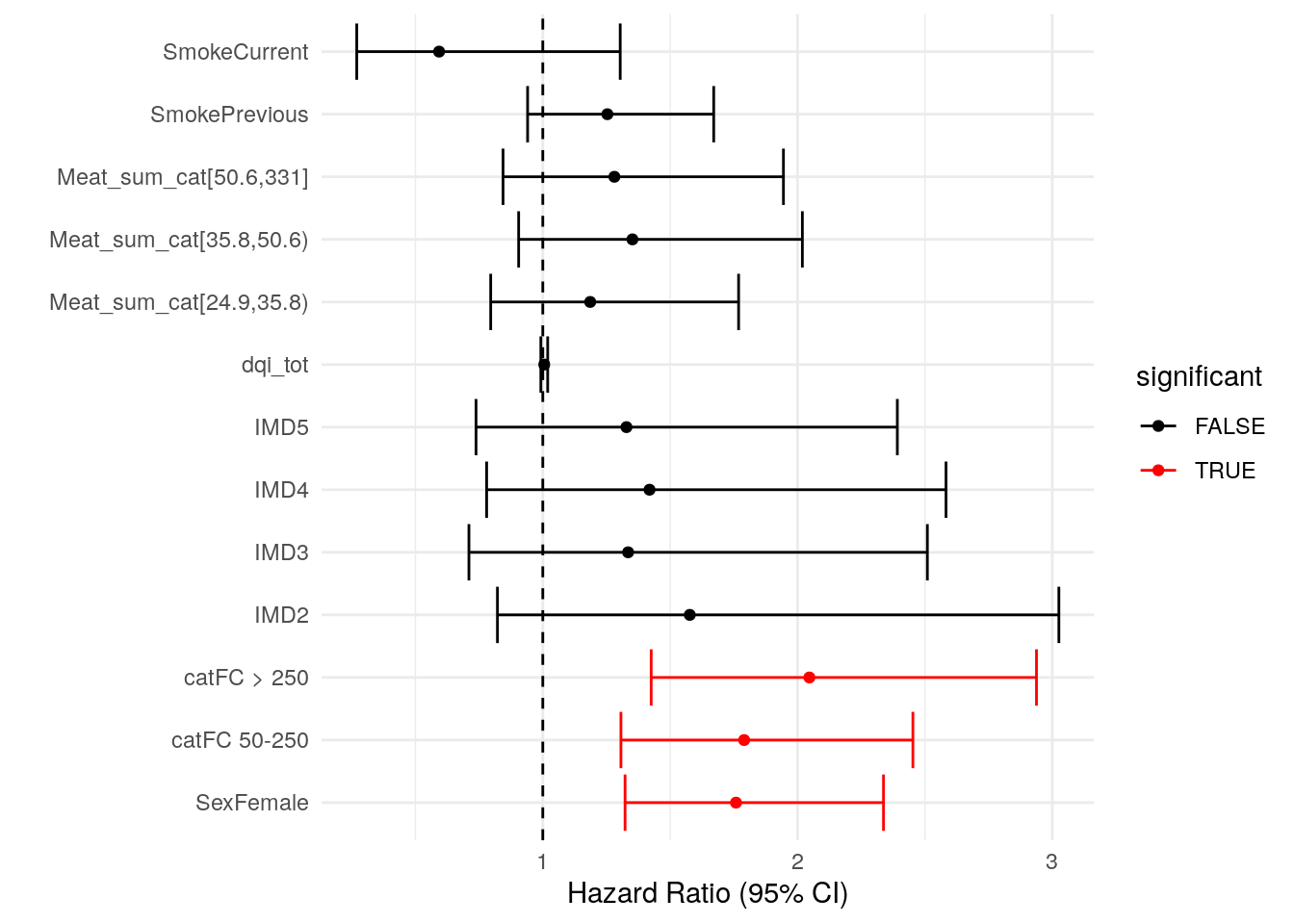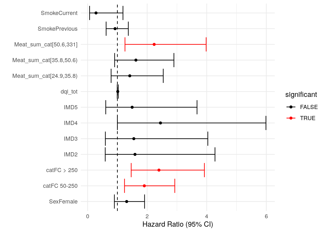 # Fit pooled Cox modelwith(mice_meat_uc_soft,coxph(Surv(softflare_time, softflare)~Sex+cat+IMD+dqi_tot+Meat_sum_cat+Smoke+frailty(SiteNo)))%>%mice::pool()%>%summary(conf.int =TRUE, conf.level =0.95, exponentiate =TRUE)%>%summon_plot_broom_hr()