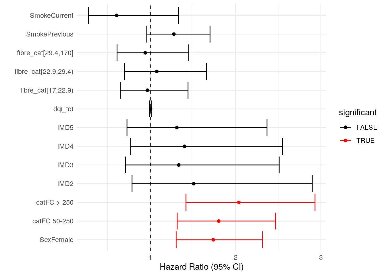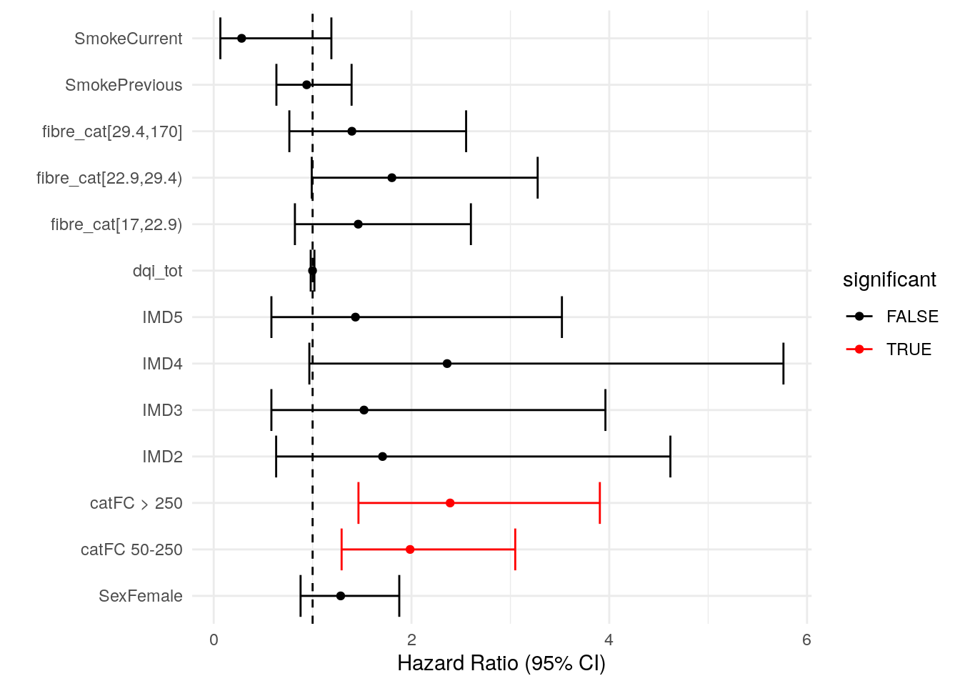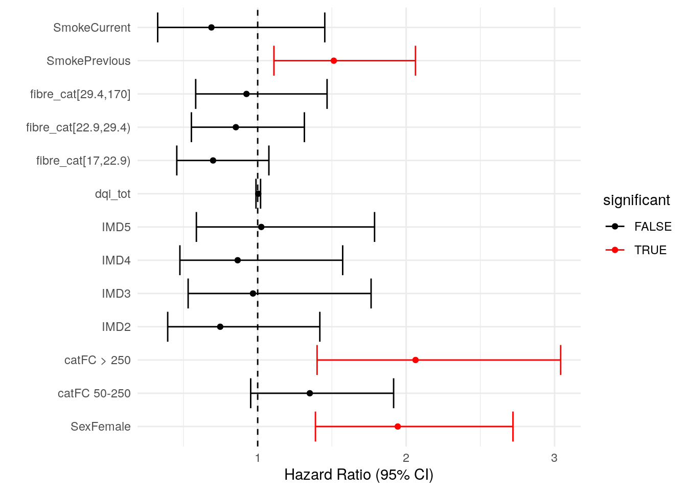 # Fit pooled Cox modelwith(mice_fibre_cd_hard,coxph(Surv(hardflare_time, hardflare)~Sex+cat+IMD+dqi_tot+fibre_cat+Smoke+frailty(SiteNo)))%>%mice::pool()%>%summary(conf.int =TRUE, conf.level =0.95, exponentiate =TRUE)%>%summon_plot_broom_hr()