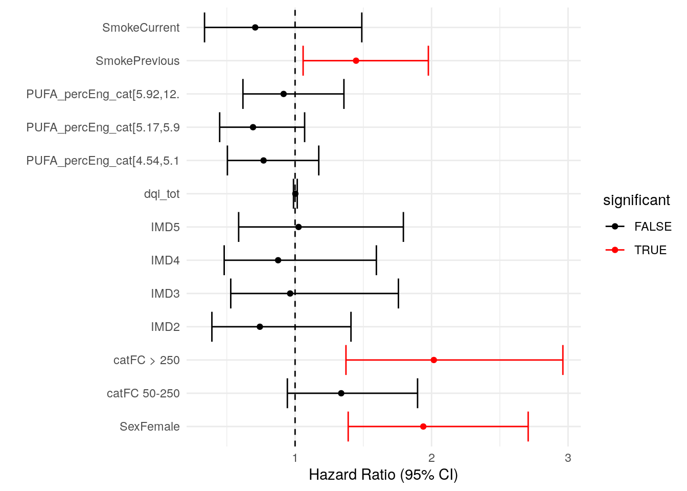 # Fit pooled Cox modelwith(mice_pufa_cd_hard,coxph(Surv(hardflare_time, hardflare)~Sex+cat+IMD+dqi_tot+PUFA_percEng_cat+Smoke+frailty(SiteNo)))%>%mice::pool()%>%summary(conf.int =TRUE, conf.level =0.95, exponentiate =TRUE)%>%summon_plot_broom_hr()