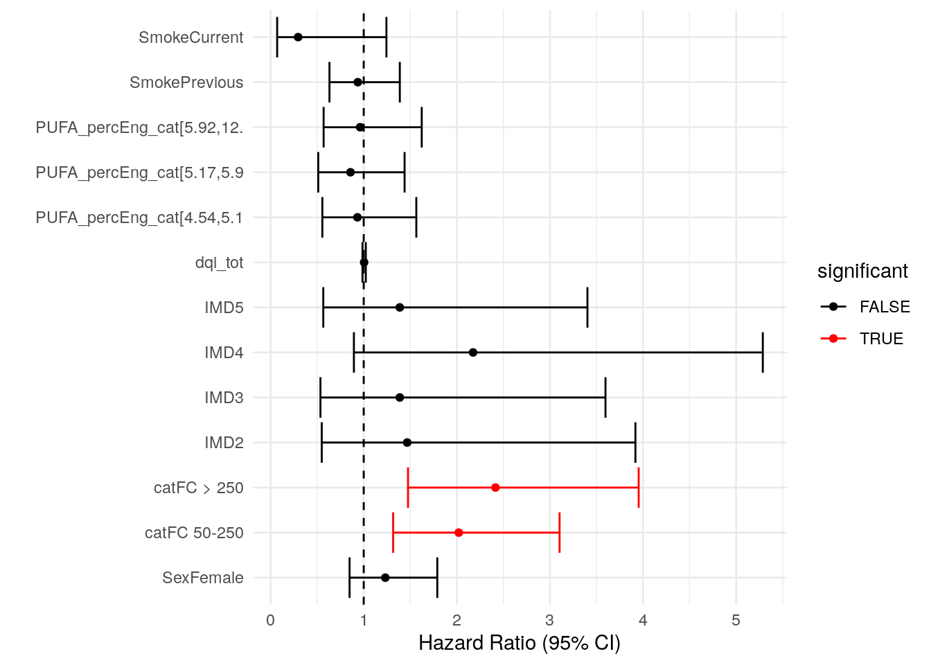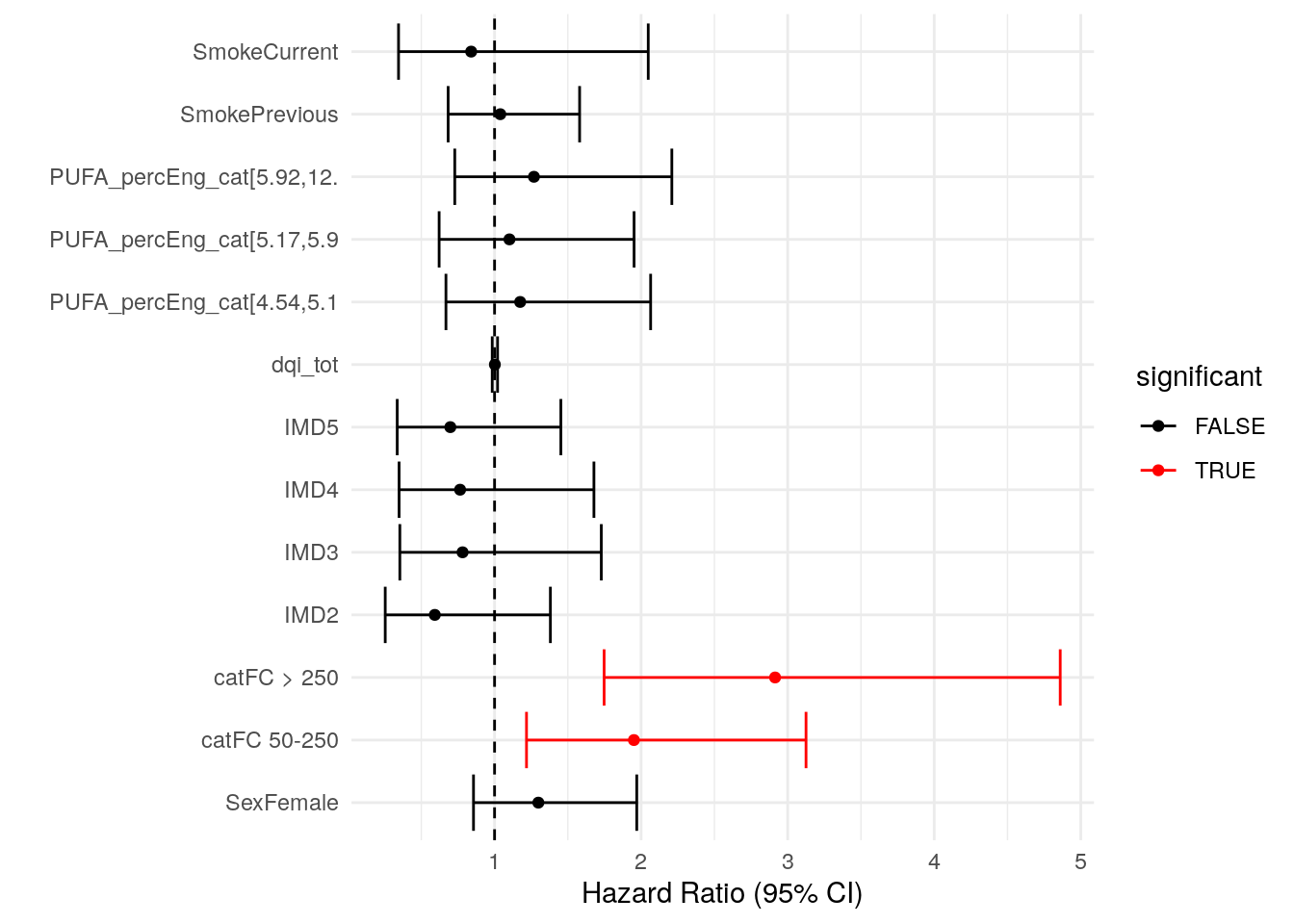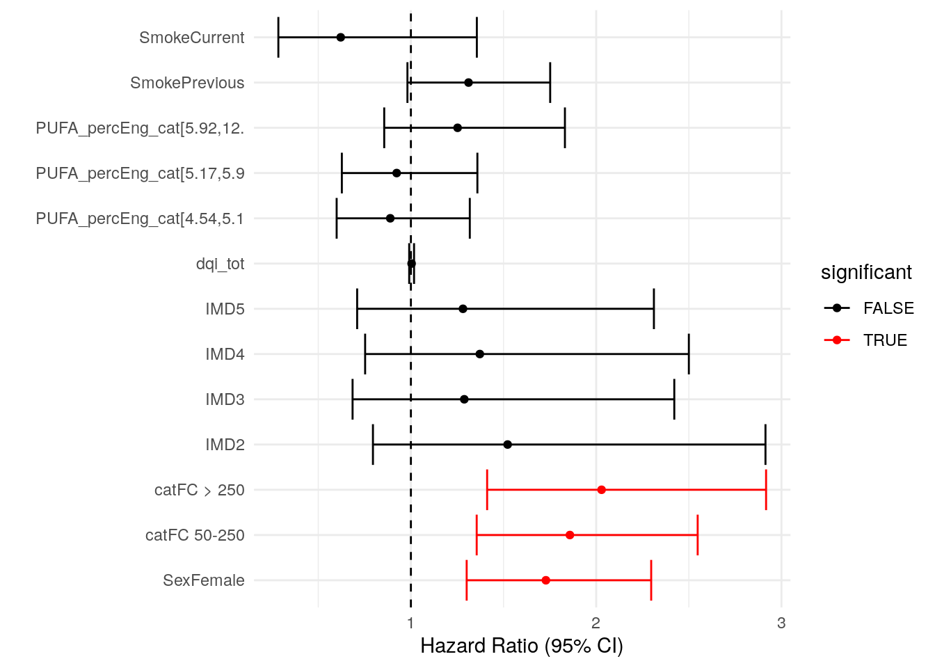 # Fit pooled Cox modelwith(mice_pufa_uc_hard,coxph(Surv(hardflare_time, hardflare)~Sex+cat+IMD+dqi_tot+PUFA_percEng_cat+Smoke+frailty(SiteNo)))%>%mice::pool()%>%summary(conf.int =TRUE, conf.level =0.95, exponentiate =TRUE)%>%summon_plot_broom_hr()