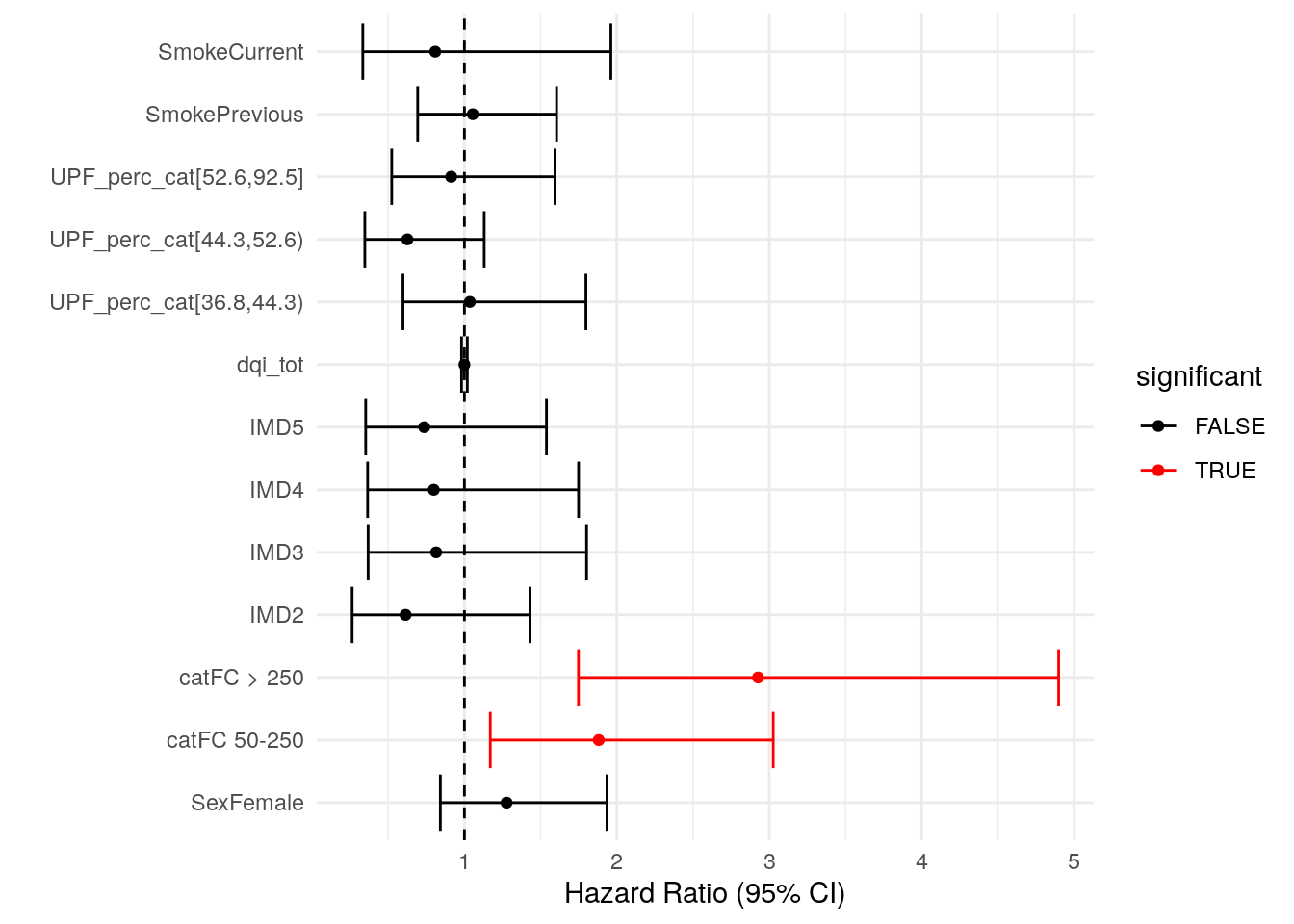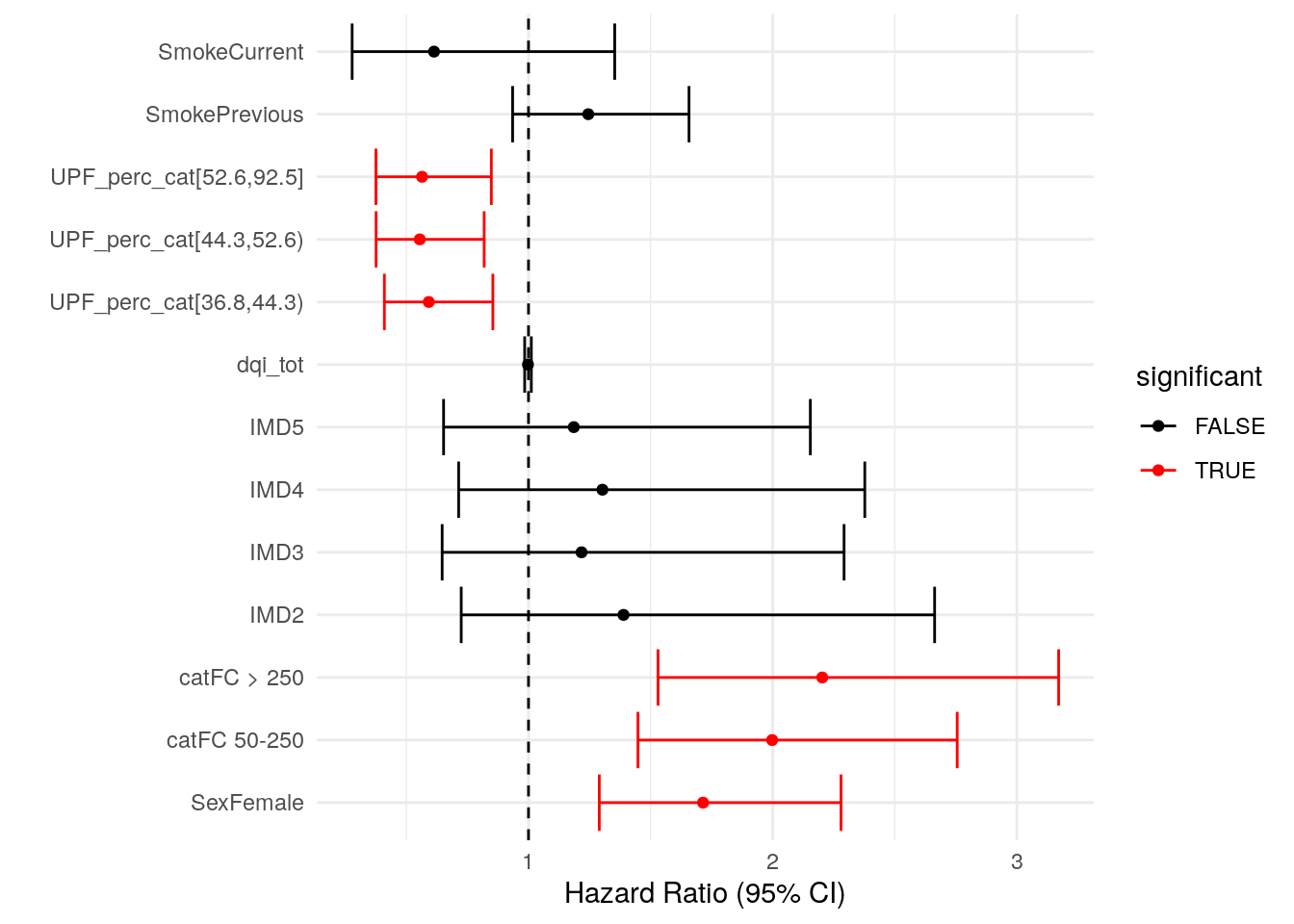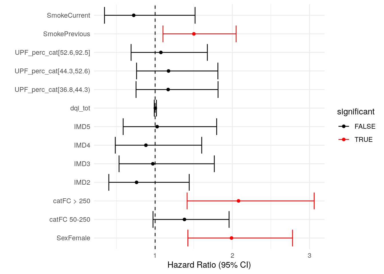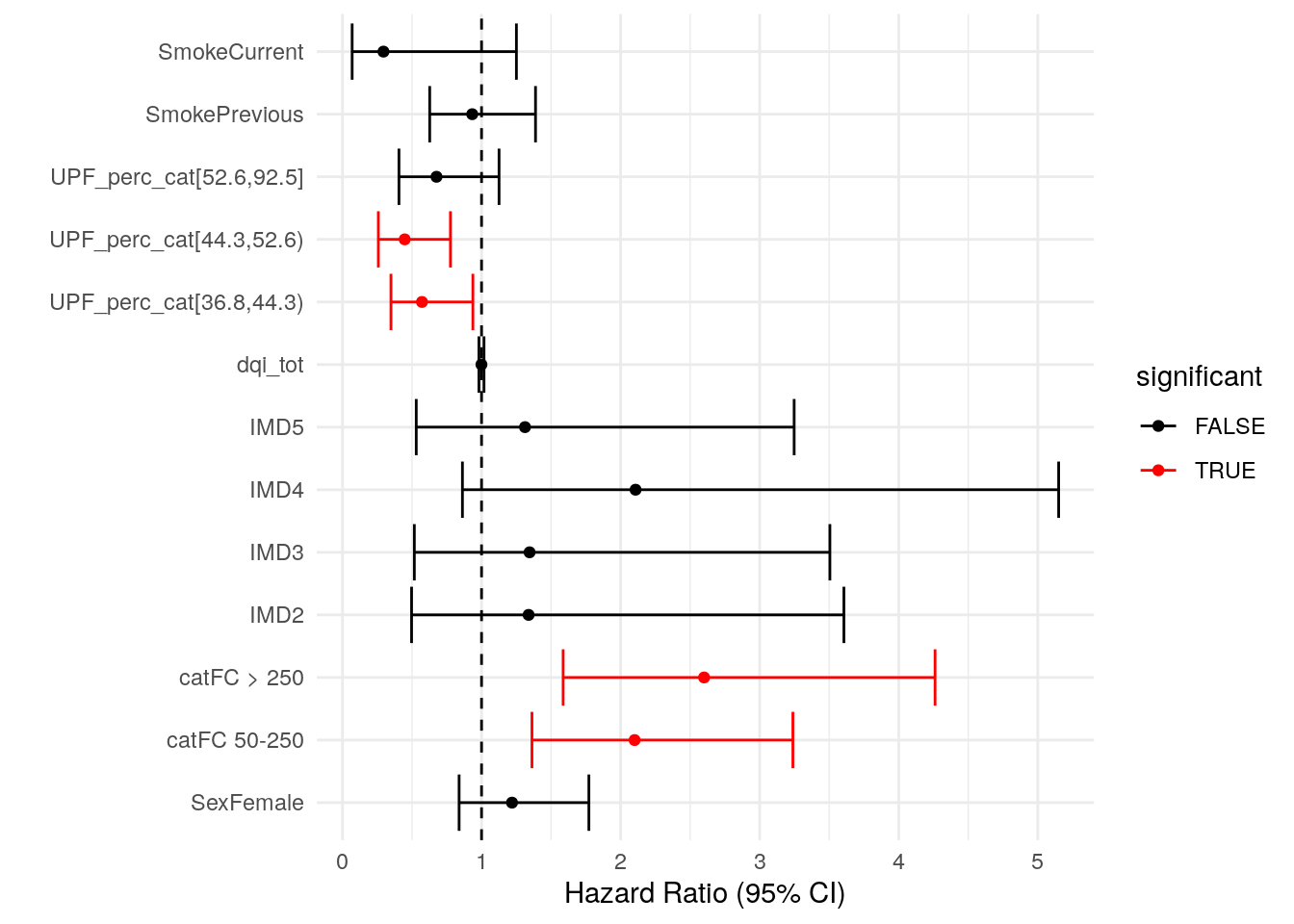 # Fit pooled Cox modelwith(mice_upf_uc_hard,coxph(Surv(hardflare_time, hardflare)~Sex+cat+IMD+dqi_tot+UPF_perc_cat+Smoke+frailty(SiteNo)))%>%mice::pool()%>%summary(conf.int =TRUE, conf.level =0.95, exponentiate =TRUE)%>%summon_plot_broom_hr()
